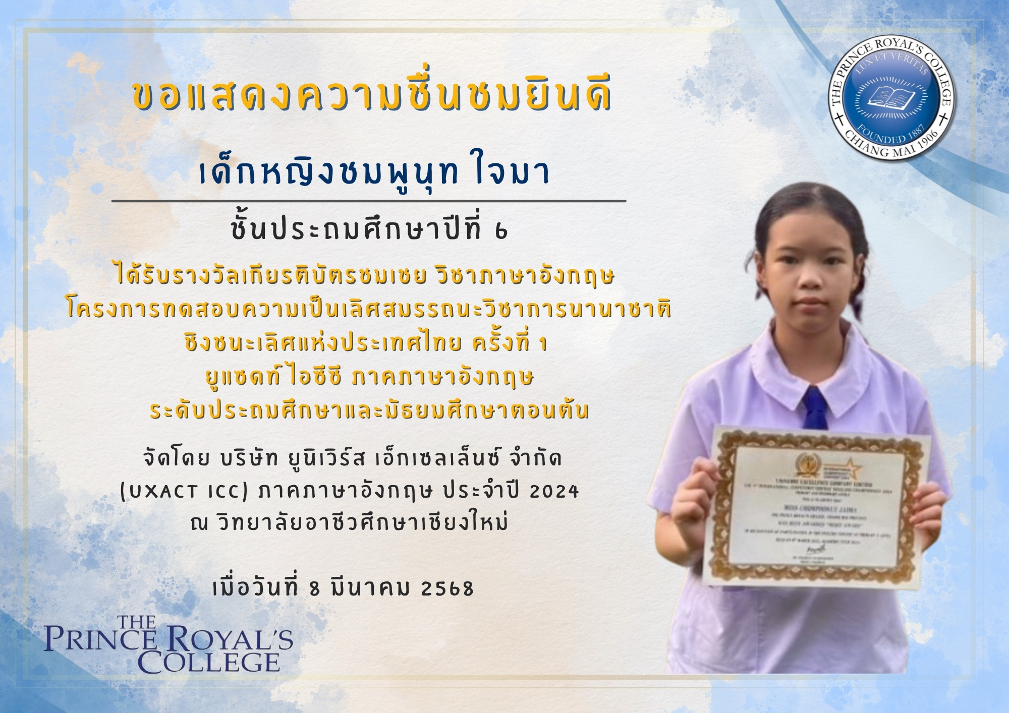 เด็กหญิงชมพูนุท ใจมา รางวัลเกียรติบัตรชมเชย วิชาภาษาอังกฤษ  โครงการทดสอบความเป็นเลิศสมรรถนะวิชาการนานาชาติ ชิงชนะเลิศแห่งประเทศไทย ครั้งที่ 1