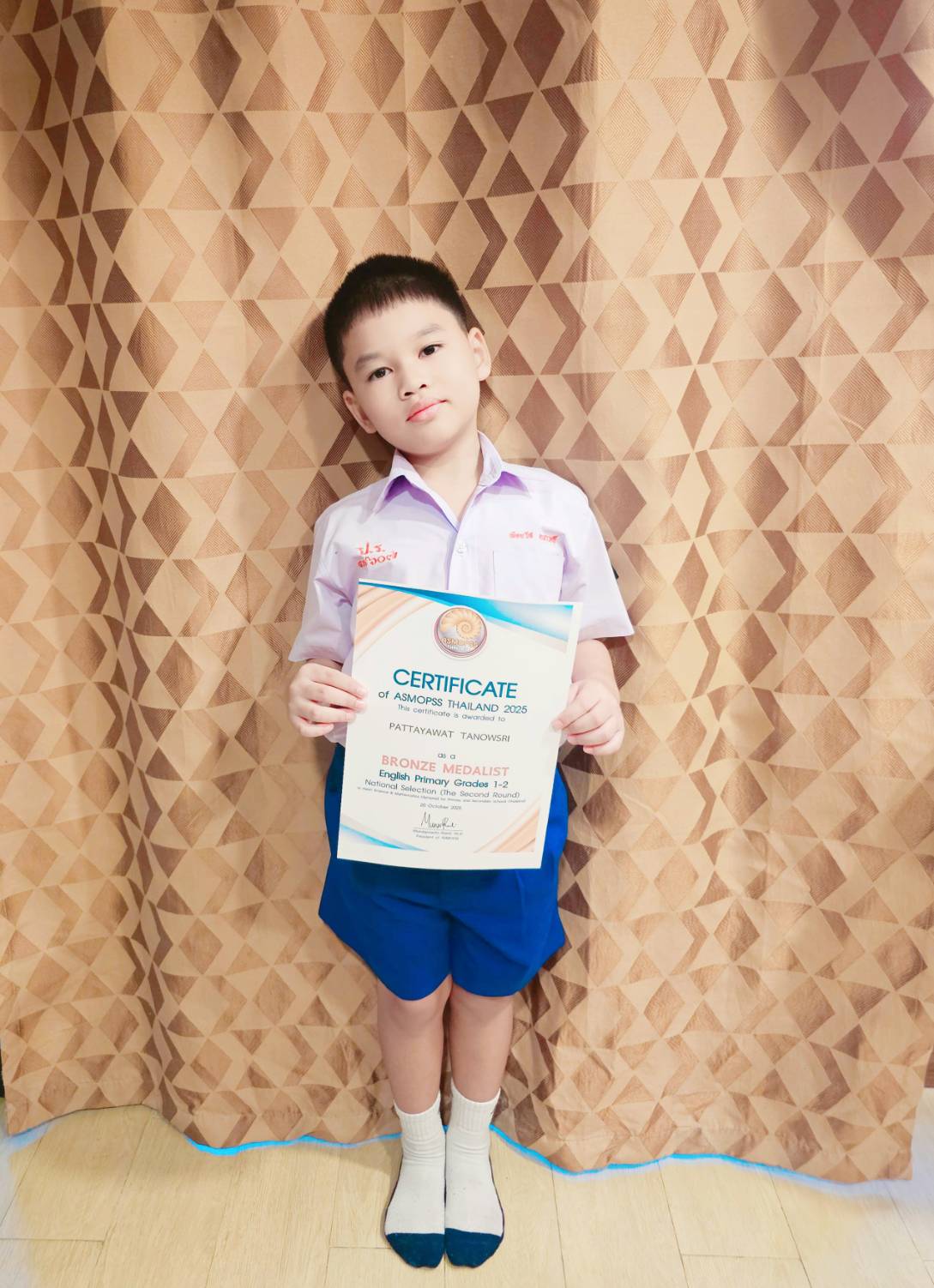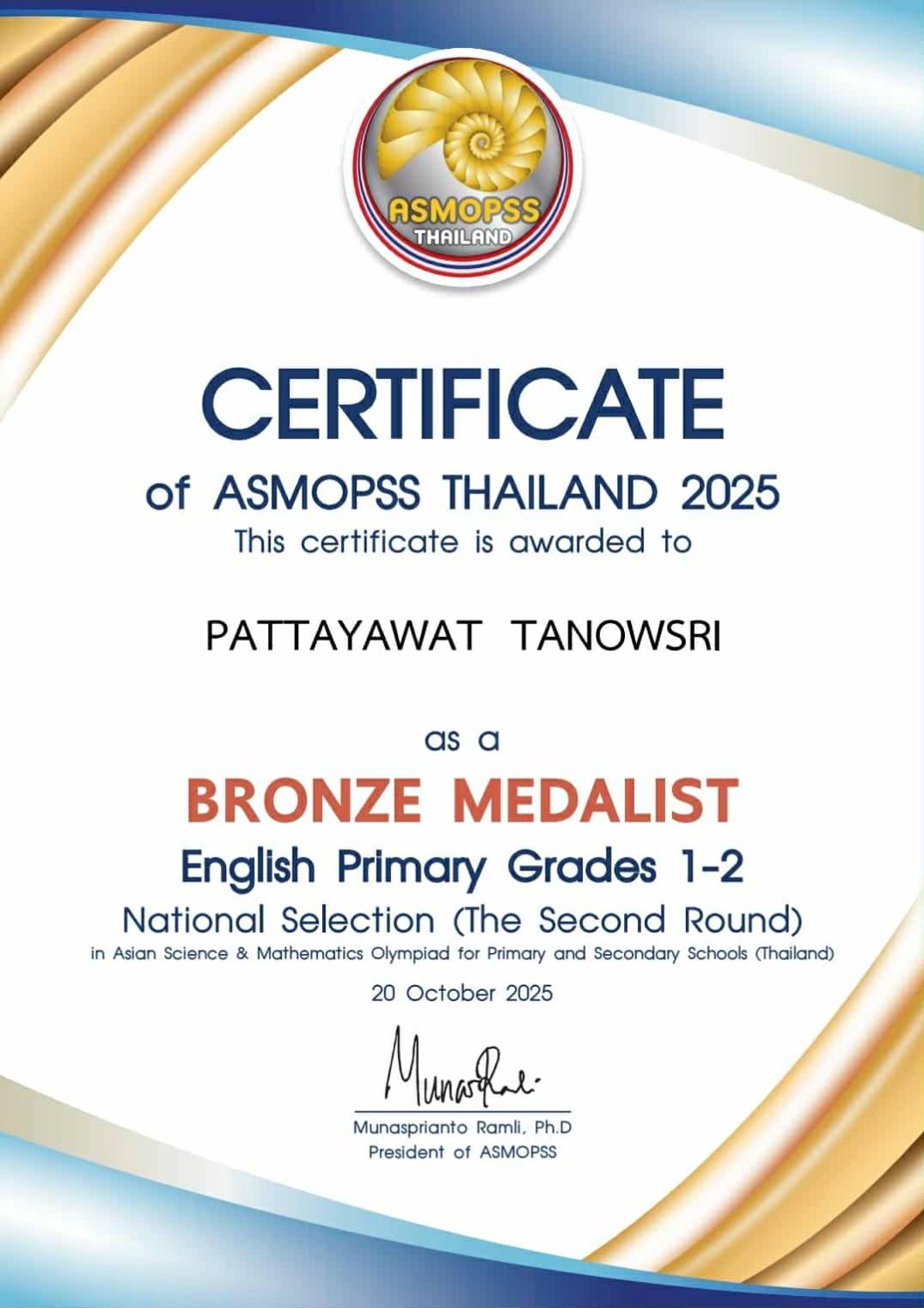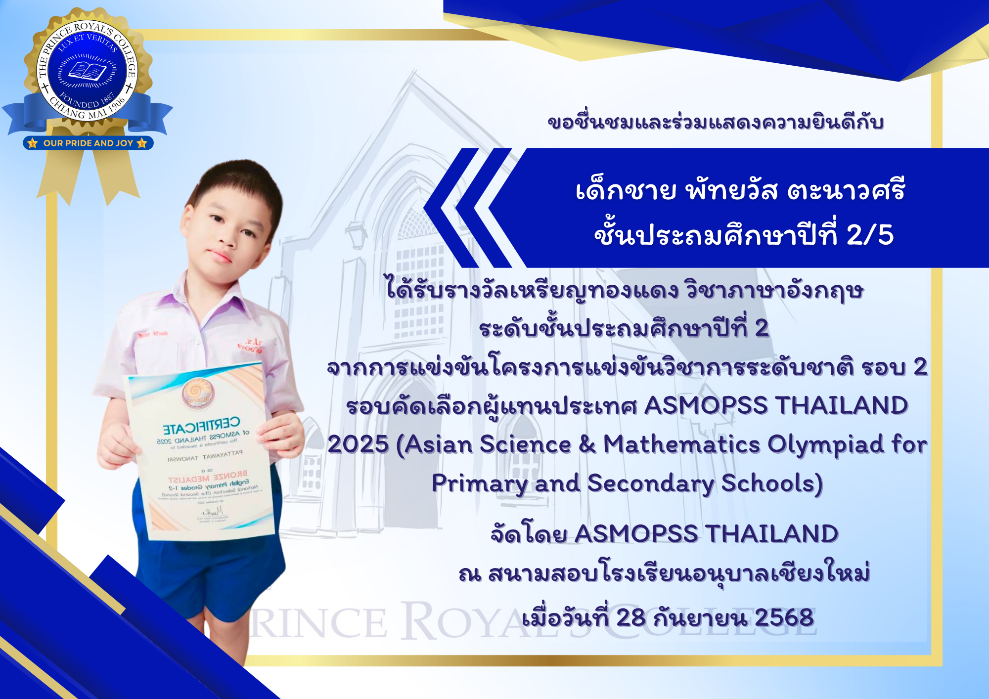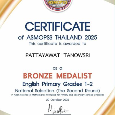 เด็กชายพัทยวัส ตะนาวศรี ชั้นประถมศึกษาปีที่ 2/5 ได้รับรางวัลเหรียญทองแดง วิชาภาษาอังกฤษ ระดับชั้นประถมศึกษาปีที่ 2 จากการแข่งขันโครงการแข่งขันวิชาการระดับชาติ รอบ 2 รอบคัดเลือกผู้แทนประเทศ ASMOPSS THAILAND 2025 (Asian Science & Mathematics Olympiad for Primary and Secondary Schools)