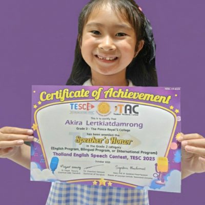 เด็กหญิงอคิราภ์ เลิศเกียรติดำรงค์ ชั้นประถมศึกษาปีที่ 2/5 ได้รับรางวัล The Speaker’s Horner. เหรียญทอง คะแแนนสูงสุดTOP20 จากการแข่งขัน โครงการแข่งขันการพูดสุนทรพจน์ภาษาอังกฤษระดับประเทศ ประจำปีพ.ศ. 2568 (Thailand English Speech Contest2025) ประเภทหลักสูตร EP/Bilingual/International program
