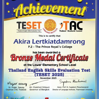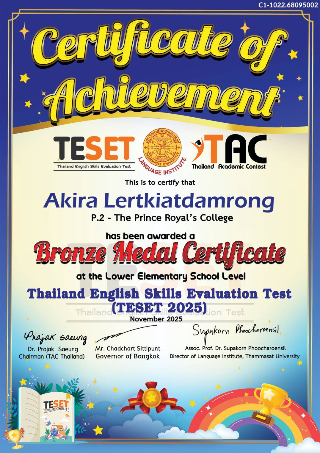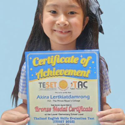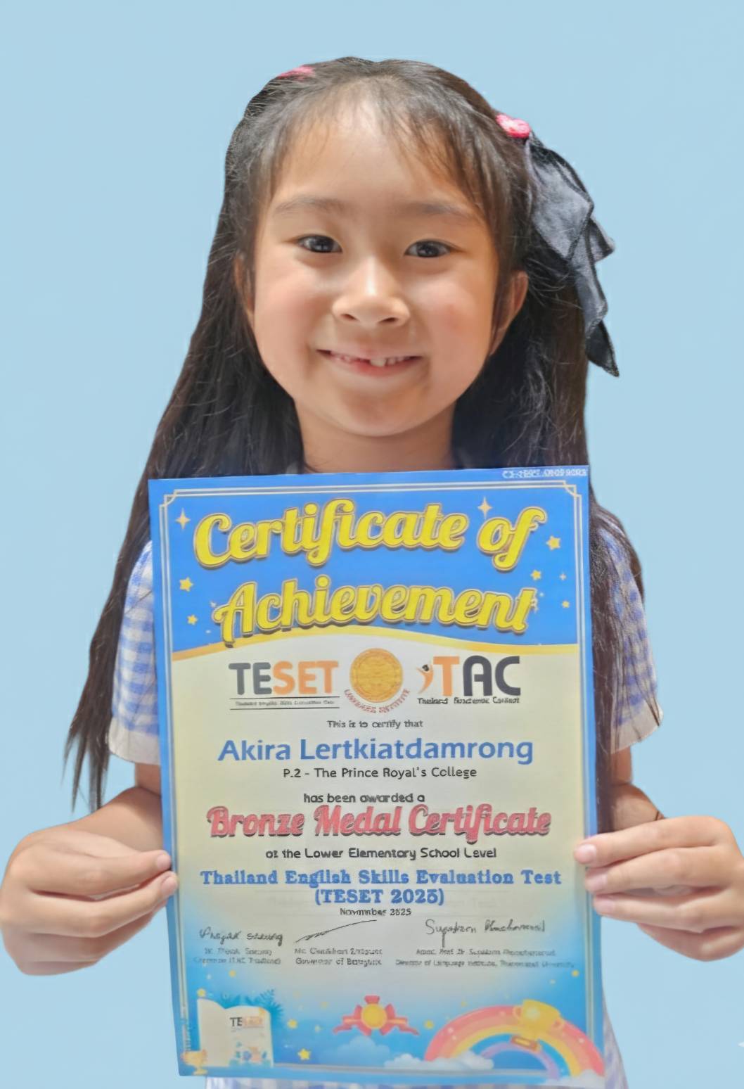 เด็กหญิงอคิราภ์ เลิศเกียรติดำรงค์  ชั้นประถมศึกษาปีที่ 2/5 ได้รับรางวัล Bronze Medal จากการแข่งขันโครงการประเมินทักษะภาษาอังกฤษระดับประเทศครั้งที่6 (6th TESET 2025-Thailand English Skills Evaluation Test)