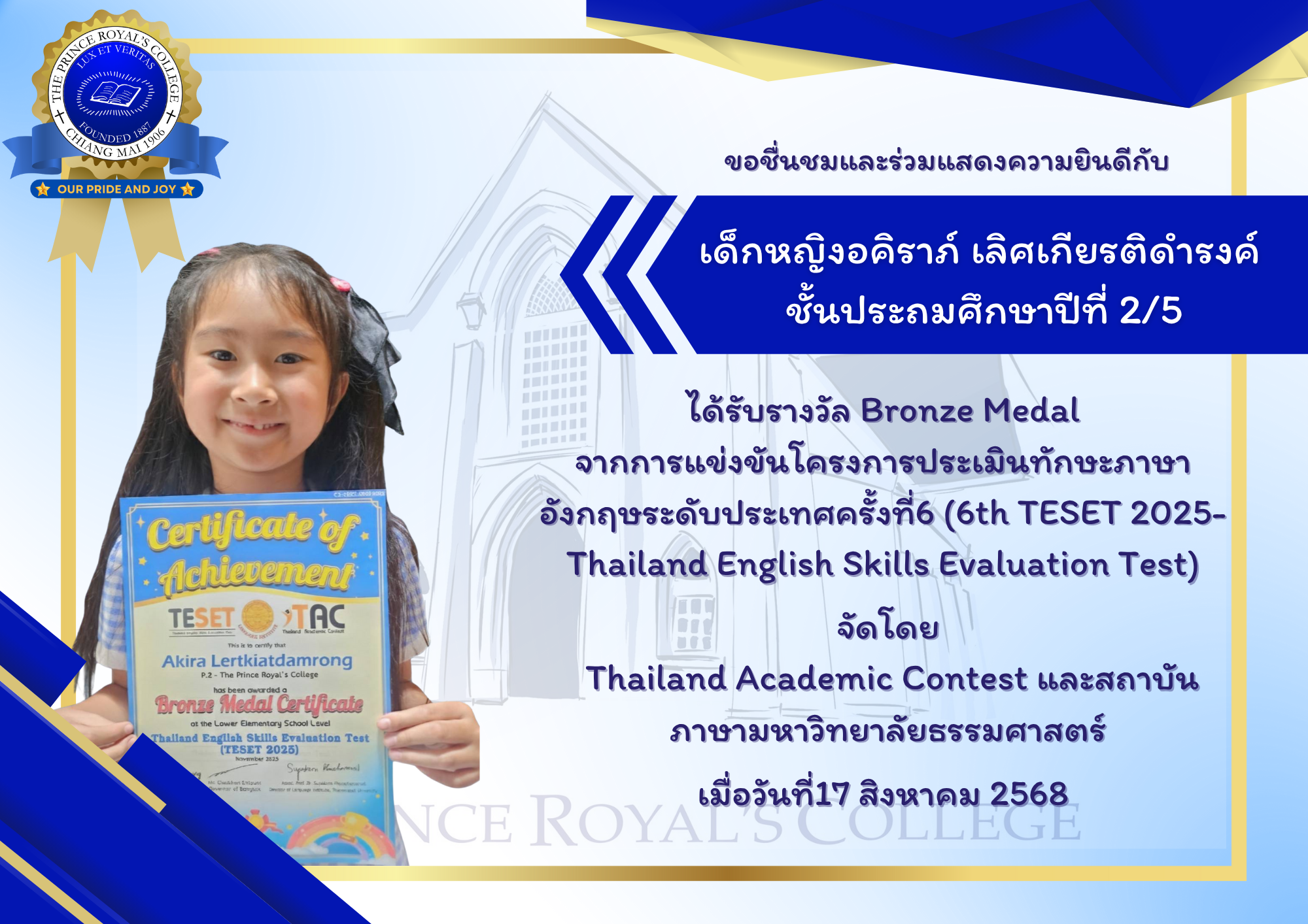 ขอชื่นชมและร่วมแสดงความยินดีกับ เด็กหญิงอคิราภ์ เลิศเกียรติดำรงค์  ชั้นประถมศึกษาปีที่ 2/5 ได้รับรางวัล Bronze Medal จากการแข่งขันโครงการประเมินทักษะภาษาอังกฤษระดับประเทศครั้งที่6 (6th TESET 2025-Thailand English Skills Evaluation Test) จัดโดย Thailand Academic Contest และสถาบันภาษามหาวิทยาลัยธรรมศาสตร์ เมื่อวันที่17 สิงหาคม 2568