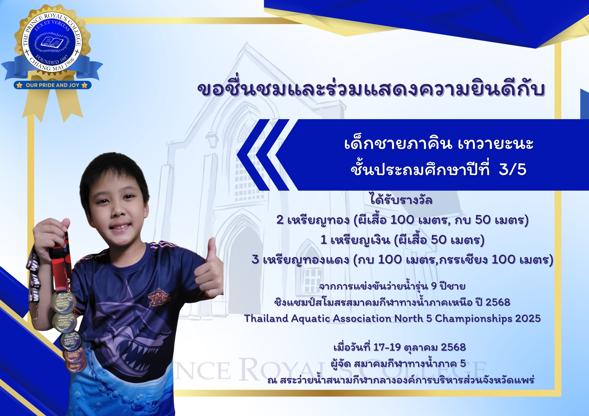 ขอชื่นชมและแสดงความยินดีกับเด็กชายภาคิน เทวายะนะ ชั้นประถมศึกษาปีที่ 3/5 ได้รับรางวัล 2 เหรียญทอง (ผีเสื้อ 100 เมตร, กบ 50 เมตร) 1 เหรียญเงิน (ผีเสื้อ 50 เมตร) 3 เหรียญทองแดง (กบ 100 เมตร,กรรเชียง 100 เมตร) จากการแข่งขัน ว่ายน้ำรุ่น 9 ปีชาย ชิงแชมป์สโมสรสมาคมกีฬาทางน้ำภาคเหนือ ปี 2568 Thailand Aquatic Association North 5 Championships 2025