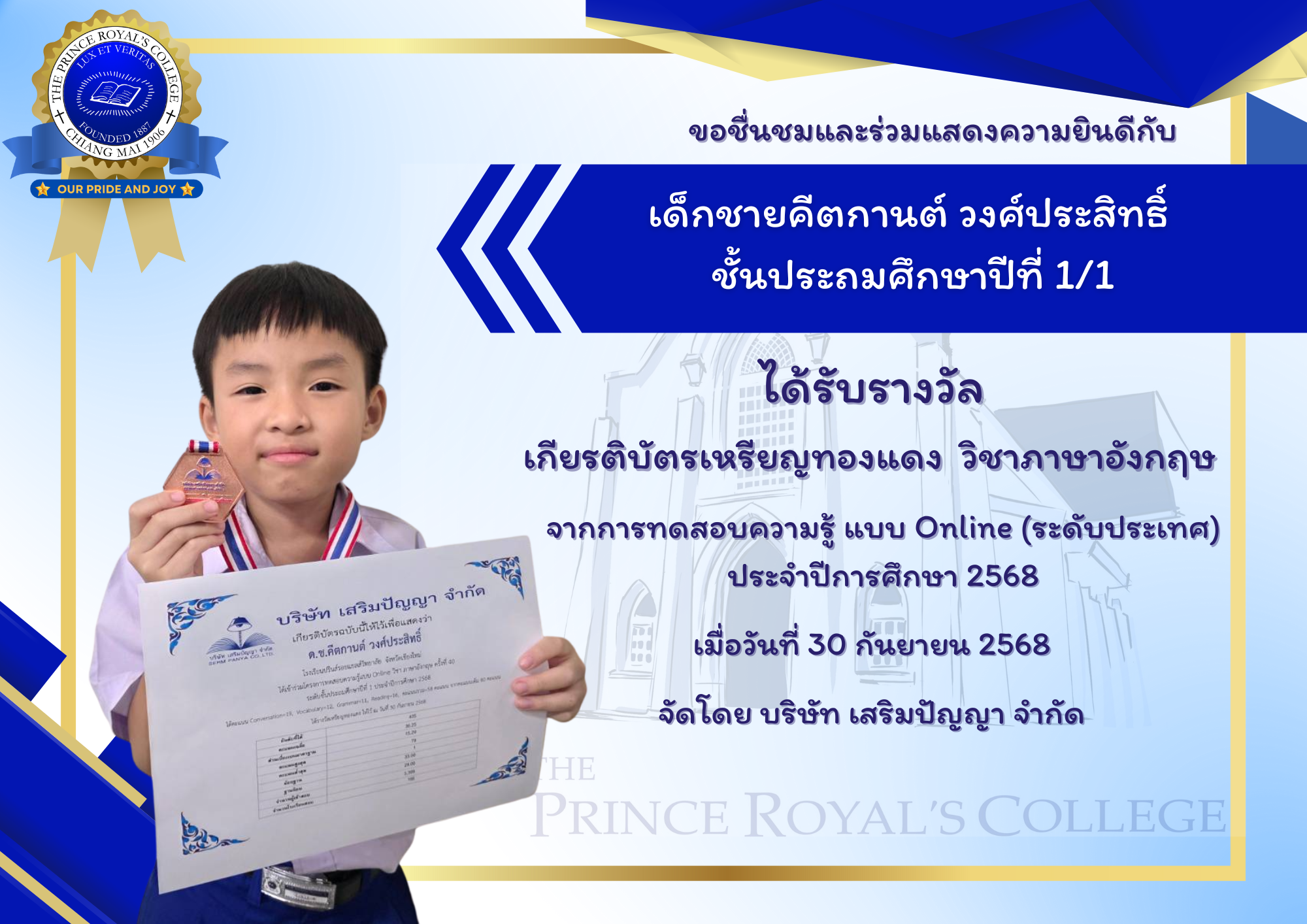 ขอชื่นชมและร่วมแสดงความยินดีกับเด็กชายคีตกานต์ วงศ์ประสิทธิ์ ชั้นประถมศึกษาปีที่ 1/1 ได้รับรางวัล เกียรติบัตรเหรียญทองแดง วิชาภาษาอังกฤษ จากการทดสอบความรู้ แบบ Online (ระดับประเทศ) ประจำปีการศึกษา 2568 เมื่อวันที่ 30 กันยายน 2568 จัดโดย บริษัท เสริมปัญญา จำกัด