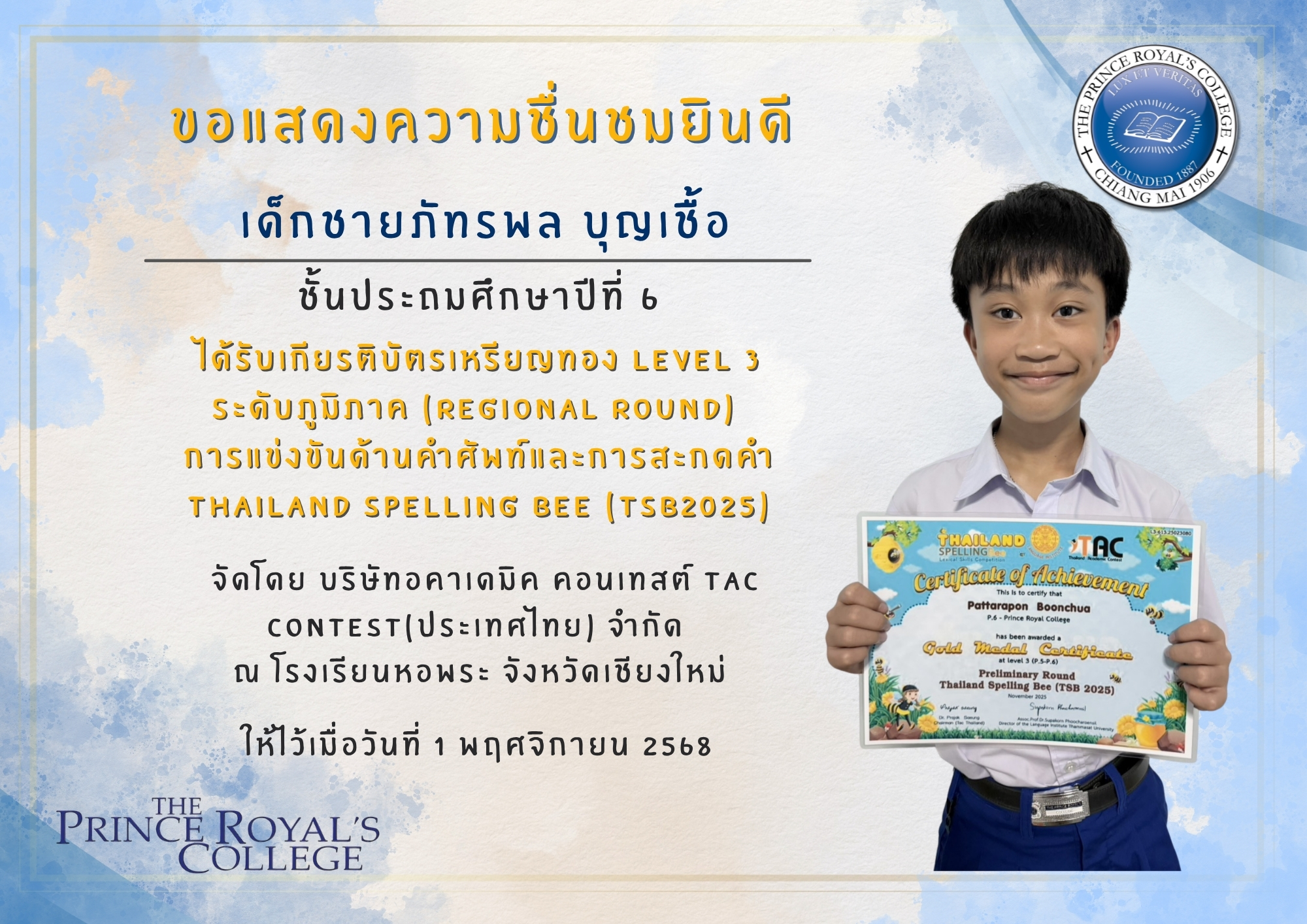 เด็กชายภัทรพล บุญเชื้อ เกียรติบัตรเหรียญทอง Level 3  ระดับภูมิภาค (regional round) การแข่งขันด้านคำศัพท์และการสะกดคำ Thailand Spelling Bee (TSB2025)