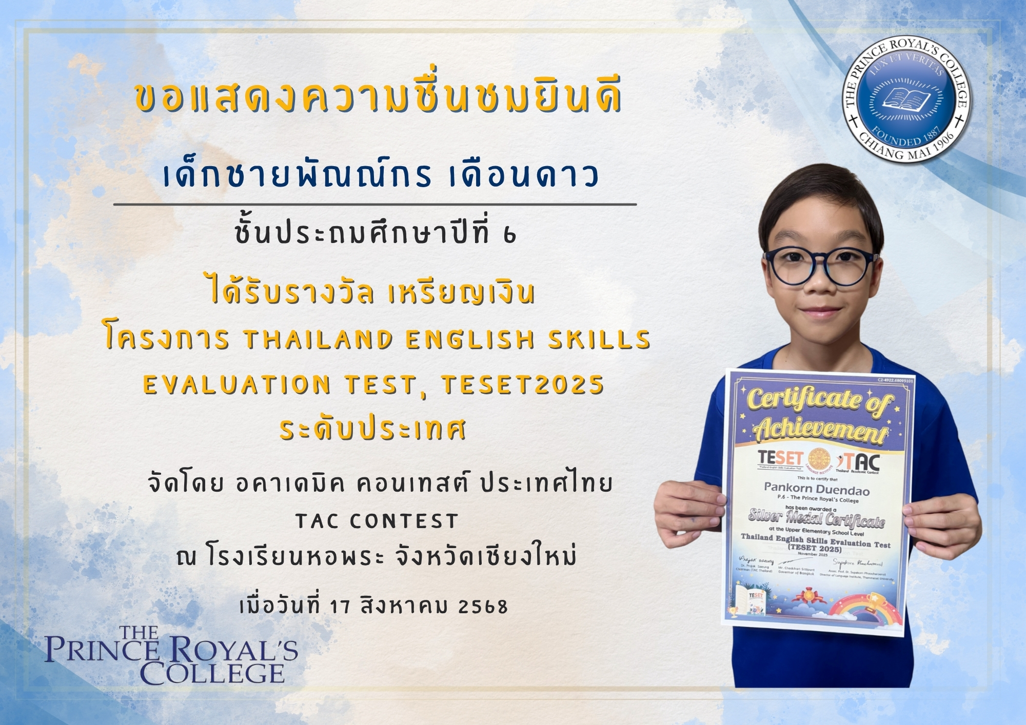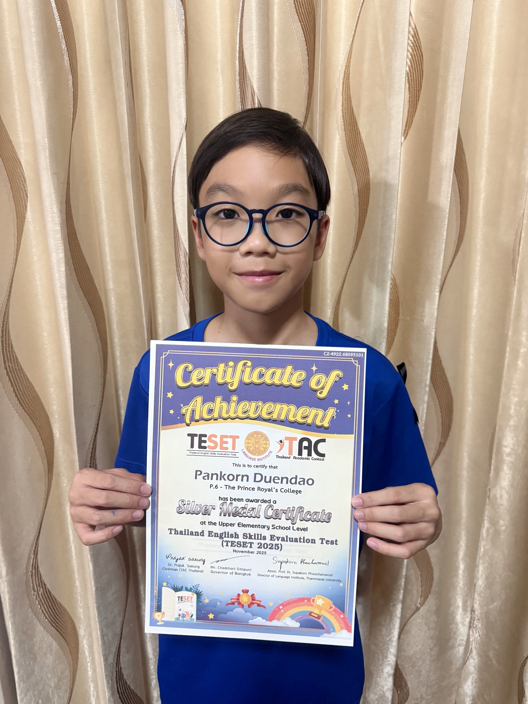 เด็กชายพัณณ์กร เดือนดาว รางวัลเหรียญเงิน โครงการ Thailand English skills Evaluation Test, TESET2025