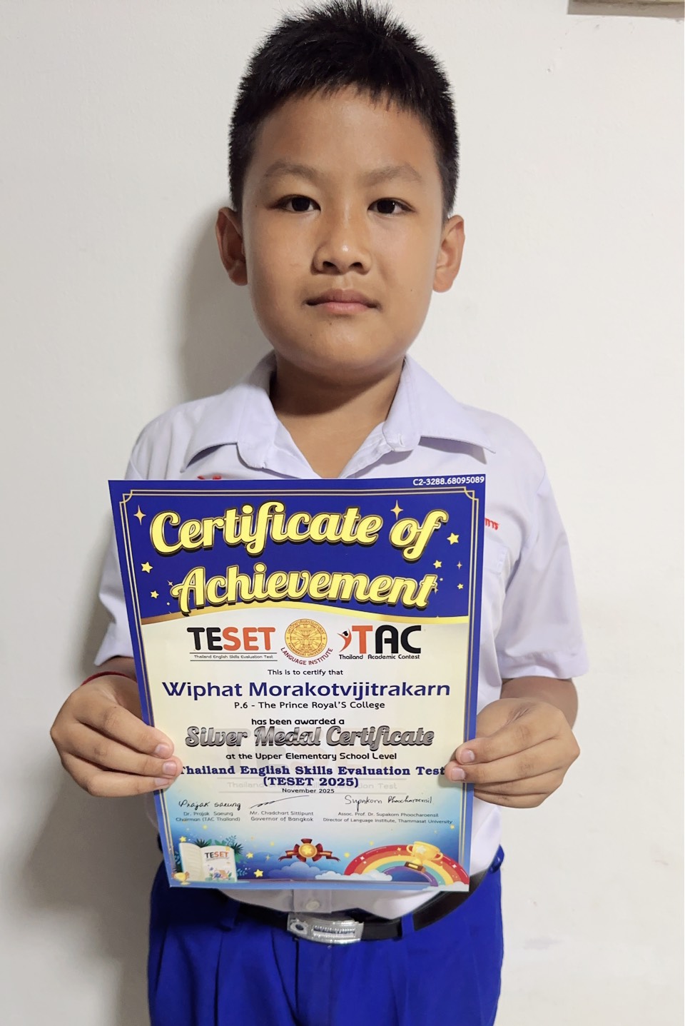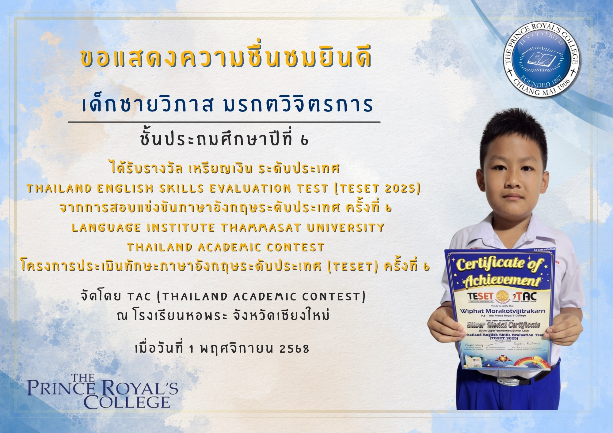 เด็กชายวิภาส มรกตวิจิตรการ รางวัลเหรียญเงิน  ระดับประเทศ Thailand English Skills Evaluation Test (TESET 2025)