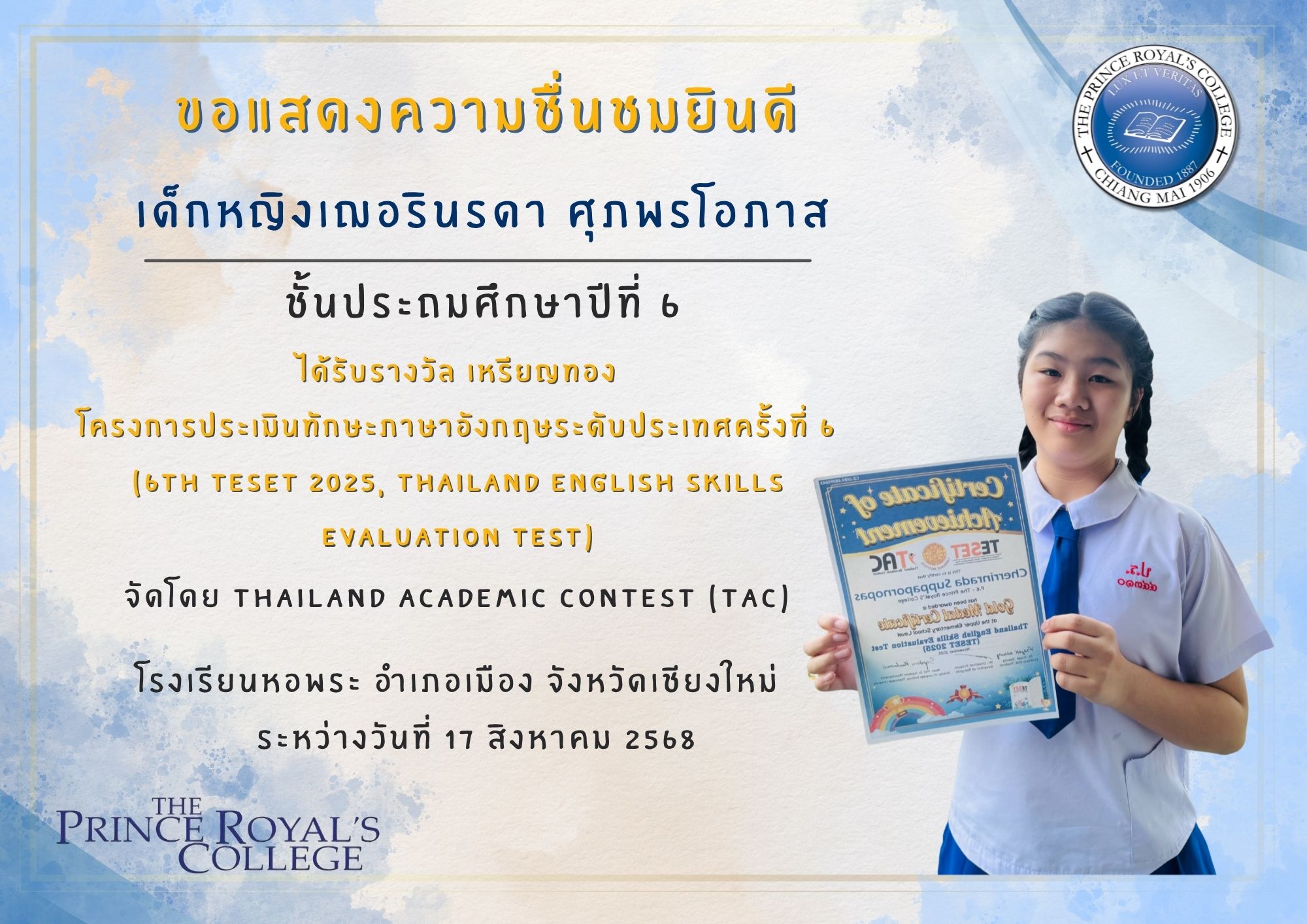 เด็กหญิงเฌอรินรดา ศุภพรโอภาส ประเมินทักษะภาษาอังกฤษระดับประเทศ ครั้งที่ 6