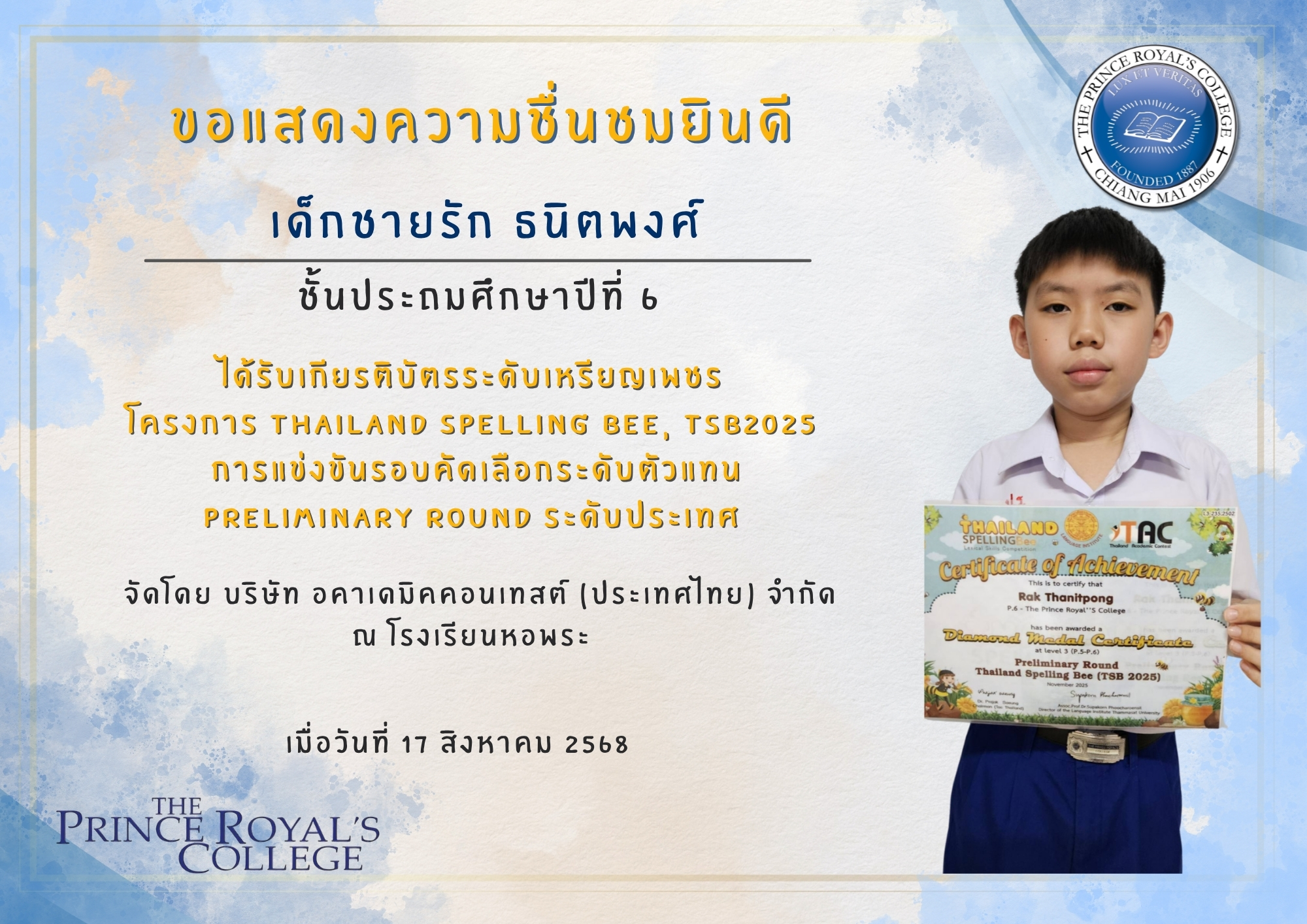 เด็กชายรัก ธนิตพงศ์ นักเรียนชั้นประถมศึกษาปีที่ 6/1