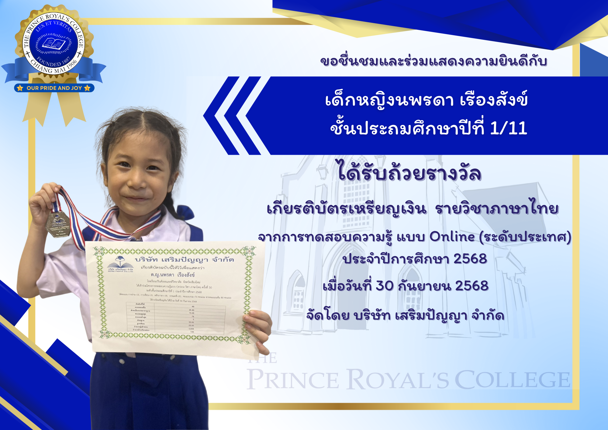 ขอชื่นชมและร่วมแสดงความยินดีกับ เด็กหญิงนพรดา เรืองสังข์ ชั้นประถมศึกษาปีที่ 1/11 ได้รับถ้วยรางวัล เกียรติบัตรเหรียญเงิน รายวิชาภาษาไทยจากการทดสอบความรู้ แบบ Online (ระดับประเทศ) ประจำปีการศึกษา 2568เมื่อวันที่ 30 กันยายน 2568จัดโดย บริษัท เสริมปัญญา จำกัด