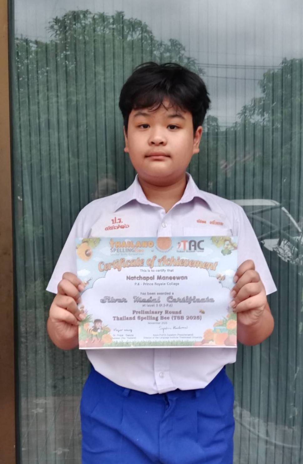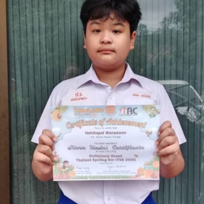 เด็กชายณัชพล มณีวรรณ เกียรติบัตรเหรียญเงิน Level 3  ระดับภูมิภาค (regional round) การแข่งขันด้านคำศัพท์และการสะกดคำ Thailand Spelling Bee (TSB2025)