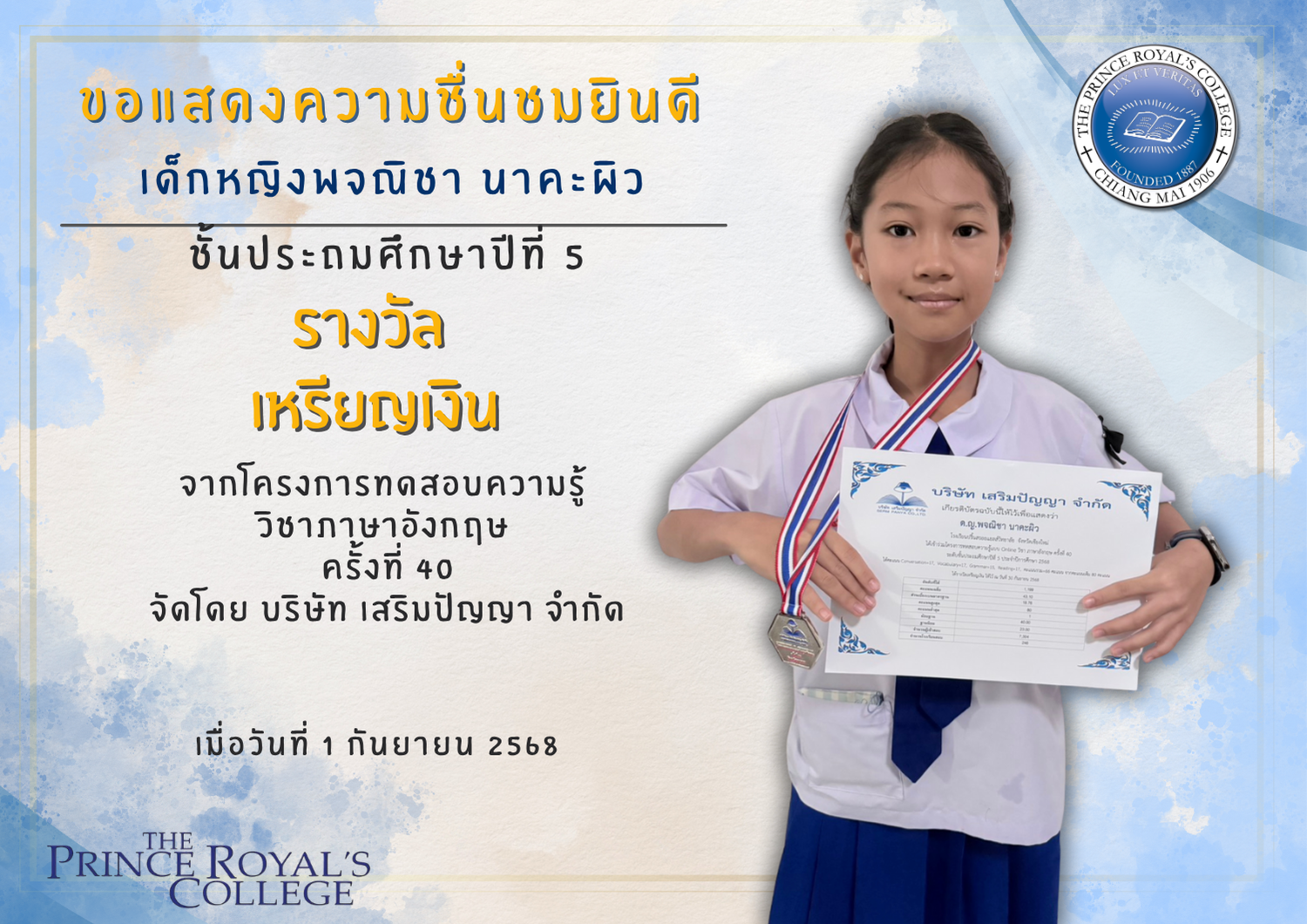 ขอแสดงความยินดีกับเด็กหญิงพจณิชา นาคะผิว นักเรียนระดับชั้นประถมศึกษาปีที่ 5