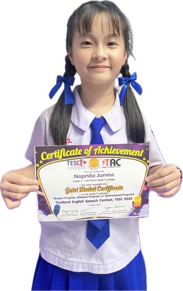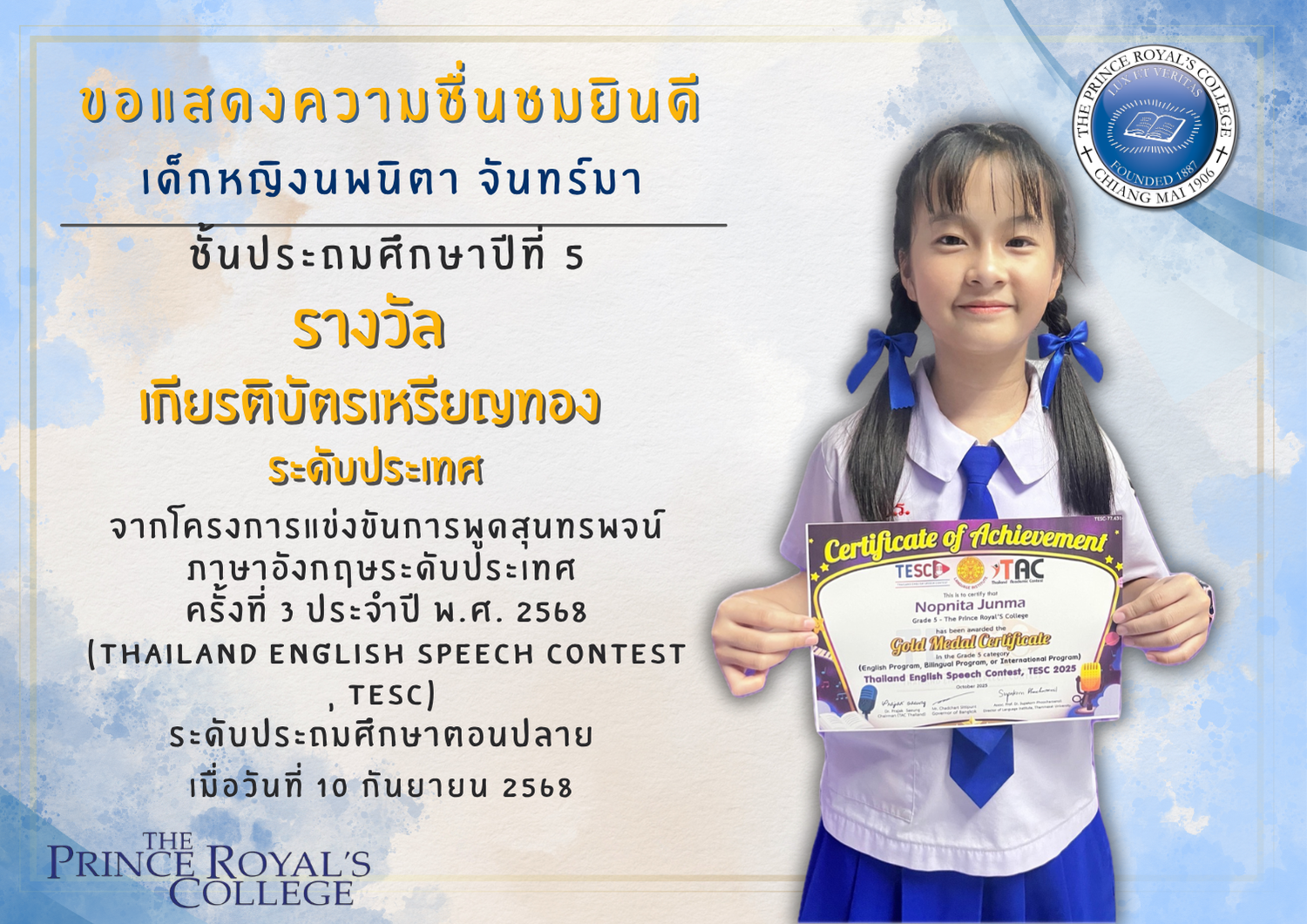เด็กหญิงนพนิตา จันทร์มา นักเรียนชั้นประถมศึกษาปีที่ 5 รางวัลเกียรติบัตรเหรียญทอง ระดับประเทศ จากโครงการแข่งขันการพูดสุนทรพจน์ภาษาอังกฤษระดับประเทศ ครั้งที่ 3 ประจำปี พ.ศ. 2568 (Thailand English Speech Contest, TESC) ระดับประถมศึกษาตอนปลาย