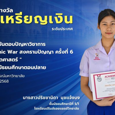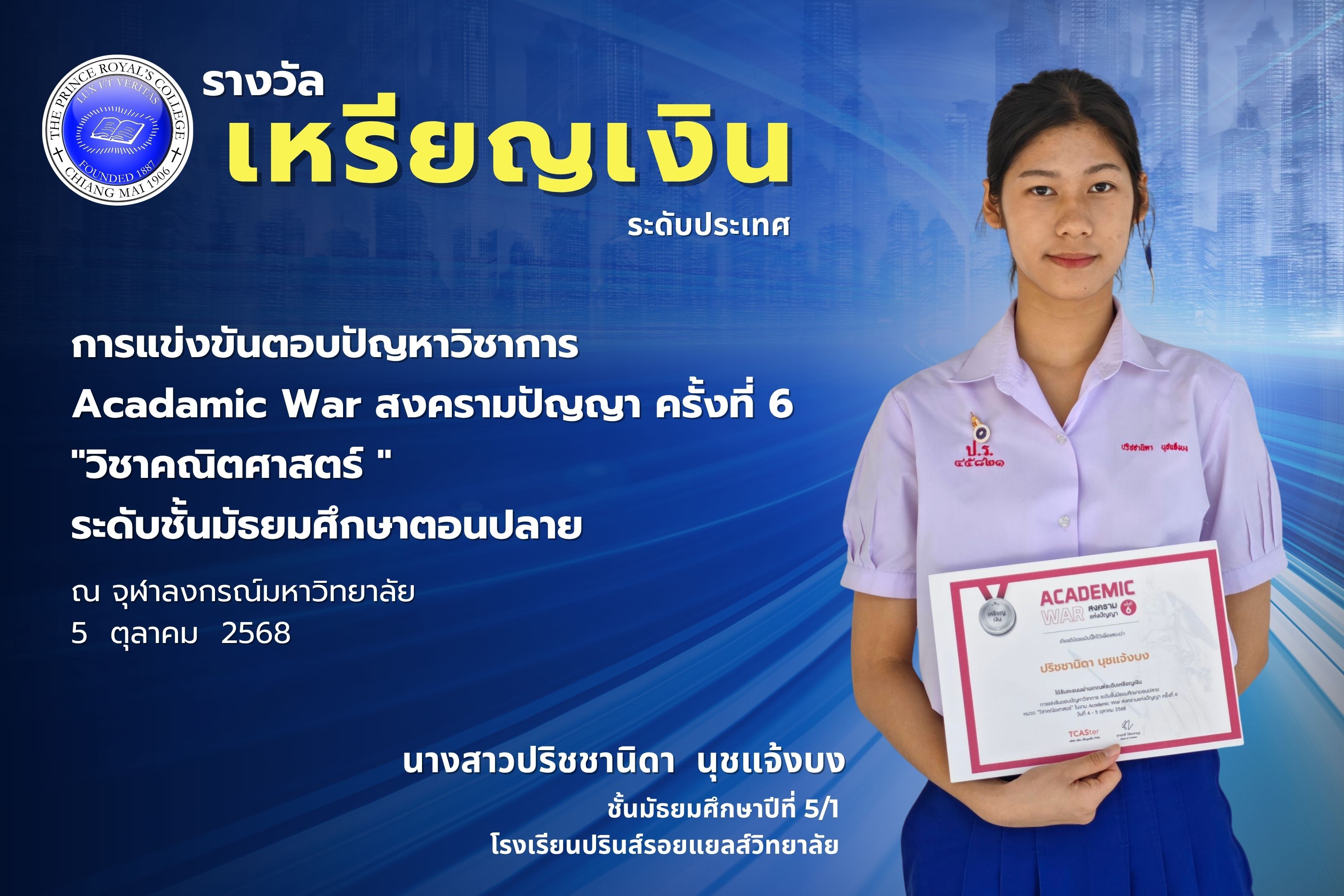 ขอชื่นชมและแสดงความยินดีกับ นางสาวปริชชานิดา นุชแจ้งบง ม.5/1 ที่ได้รับรางวัลรางวัลเหรียญเงิน จากการแข่งขันตอบปัญหาวิชาการ Acadamic War สงครามปัญญา ครั้งที่ 6 “วิชาคณิตศาสตร์ ” ระดับชั้นมัธยมศึกษาตอนปลาย ระดับประเทศ ณ จุฬาลงกรณ์มหาวิทยาลัย จัดโดย TCASter ณ จุฬาลงกรณ์มหาวิทยาลัย เมื่อวันที่ 5 ตุลาคม 2568