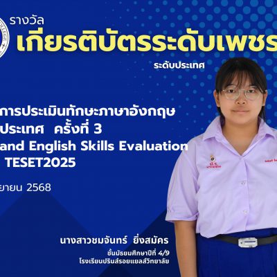 ขอชื่นชมและแสดงความยินดีกับ นางสาวชมจันทร์ ยิ่งสมัคร ม.4/9 รับรางวัลเกียรติบัตรระดับเหรียญเพชร ระดับประเทศ (คะแนนลำดับที่ 297) จากผู้เข้าสอบจำนวน 5922 คน ลำดับที่ 17 ระดับภาค และลำดับที่ 15 ระดับจังหวัด จากโครงการประเมินทักษะภาษาอังกฤษระดับประเทศ ครั้งที่ 3 Thailand English Skills Evaluation Test, TESET2025 จัดโดย TESET ประกาศผลเมื่อวันที่ 30 กันยายน 2568 (ระดับประเทศ)