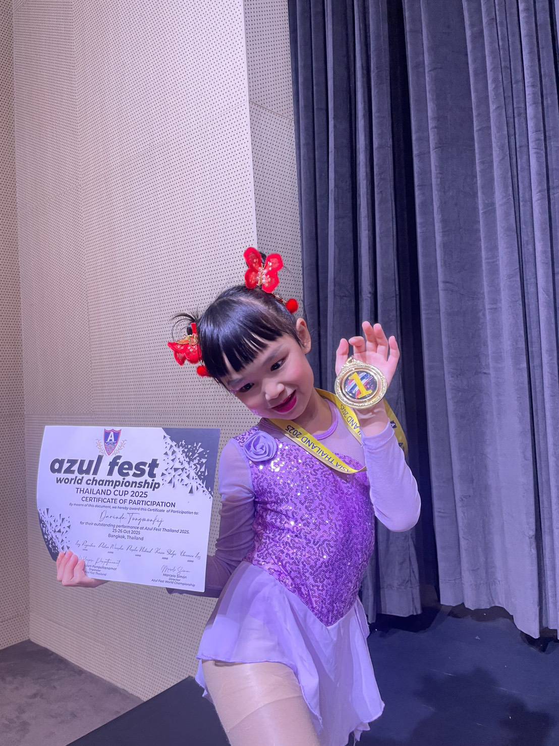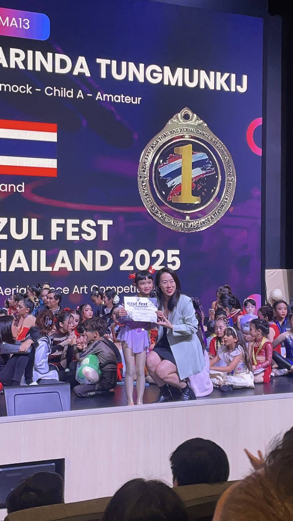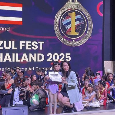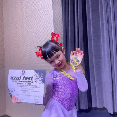 ได้รับรางวัล ชนะเลิศ เหรียญทอง รุ่น Aerial Hammock Performance Child A 7-9 Years จากการแข่งขัน Aerial Dance Arts Competition