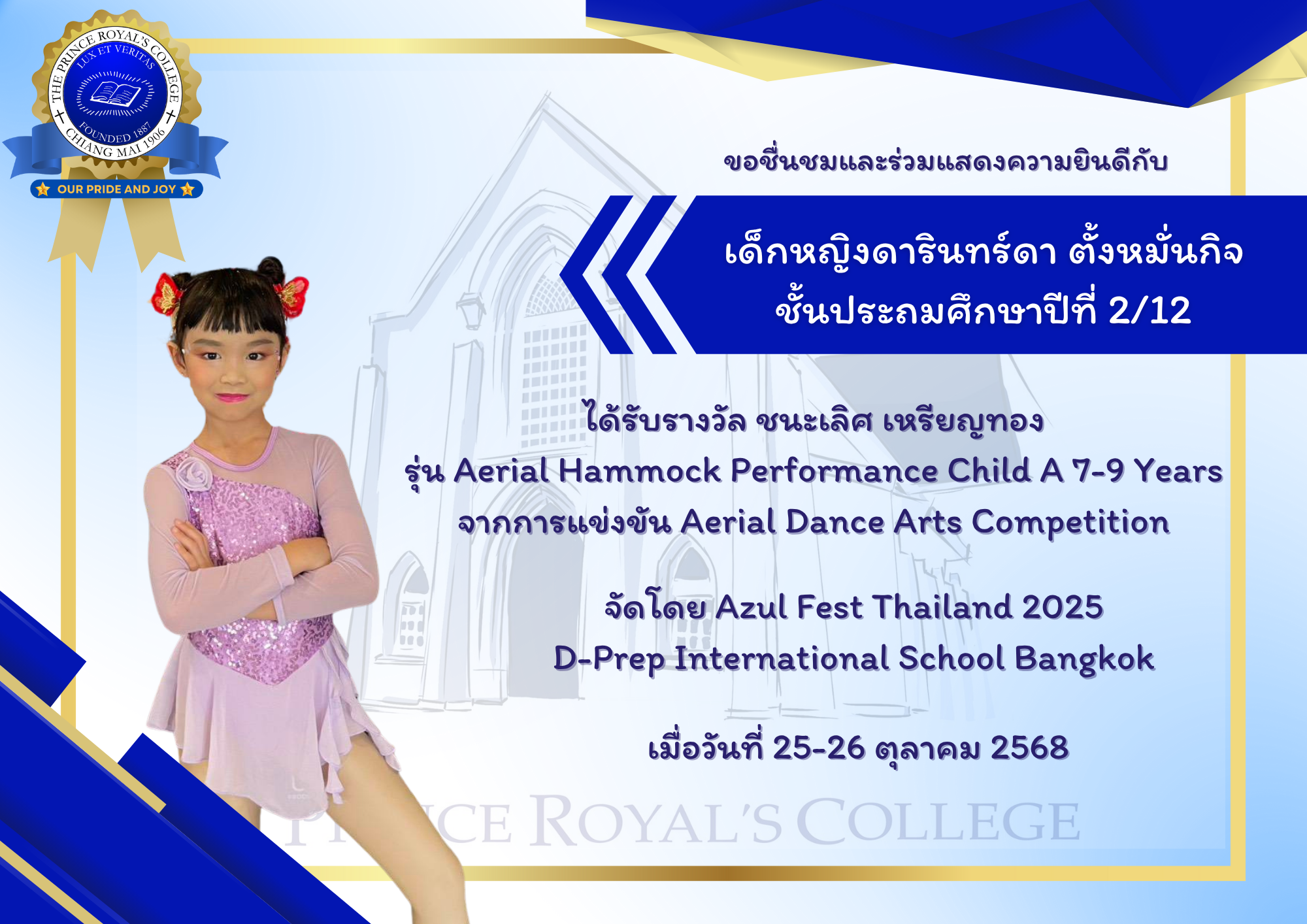 เด็กหญิงดารินทร์ดา ตั้งหมั่นกิจ ชั้นประถมศึกษาปีที่ 2/12 รางวัล ชนะเลิศ เหรียญทอง รุ่น Aerial Hammock Performance Child A 7-9 Years การแข่งขัน Aerial Dance Arts Competition