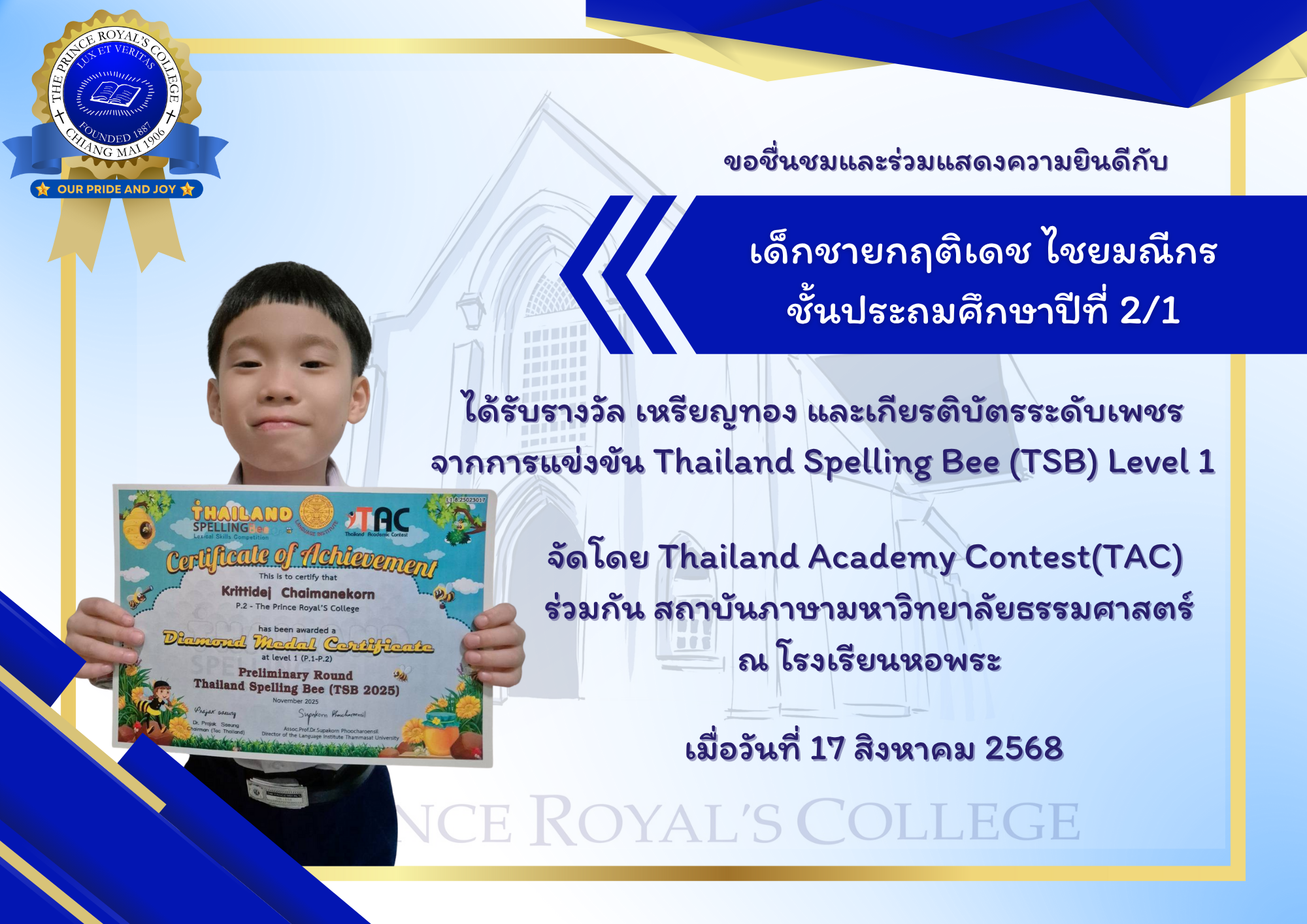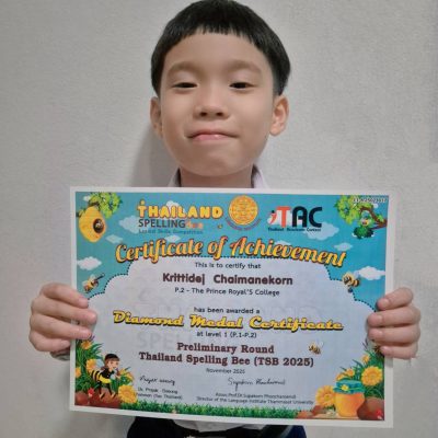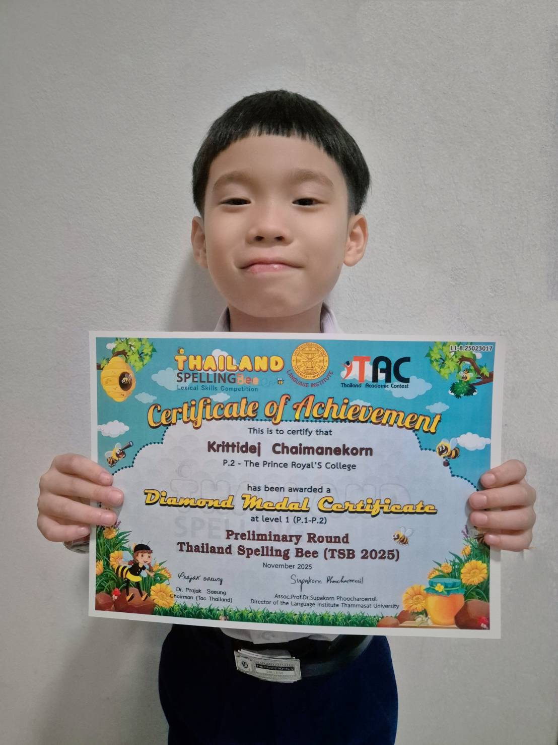 ได้รับรางวัล เหรียญทอง และเกียรติบัตรระดับเพชร จากการแข่งขัน Thailand Spelling Bee (TSB) Level 1