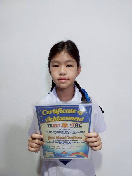 ได้รับรางวัล : เกียรติบัตรเหรียญทอง วิชาภาษาอังกฤษ ระดับชั้นประถมศึกษาปี ที่ 5