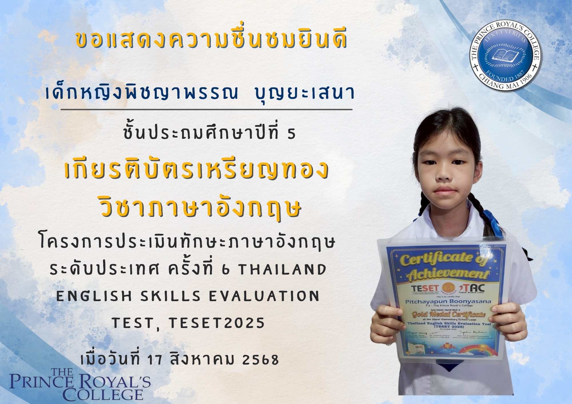 เด็กหญิงพิชญาพรรณ บุญยะเสนา ได้รับรางวัลเกียรติบัตรเหรียญทอง วิชาภาษาอังกฤษ
