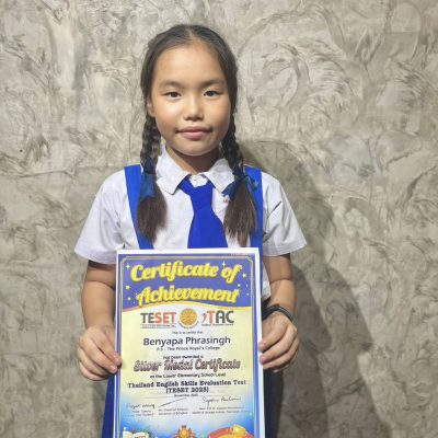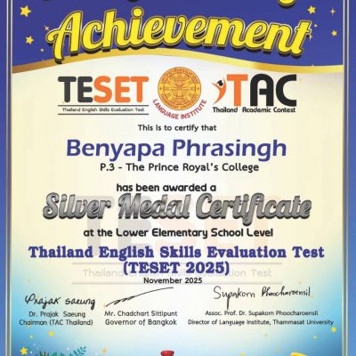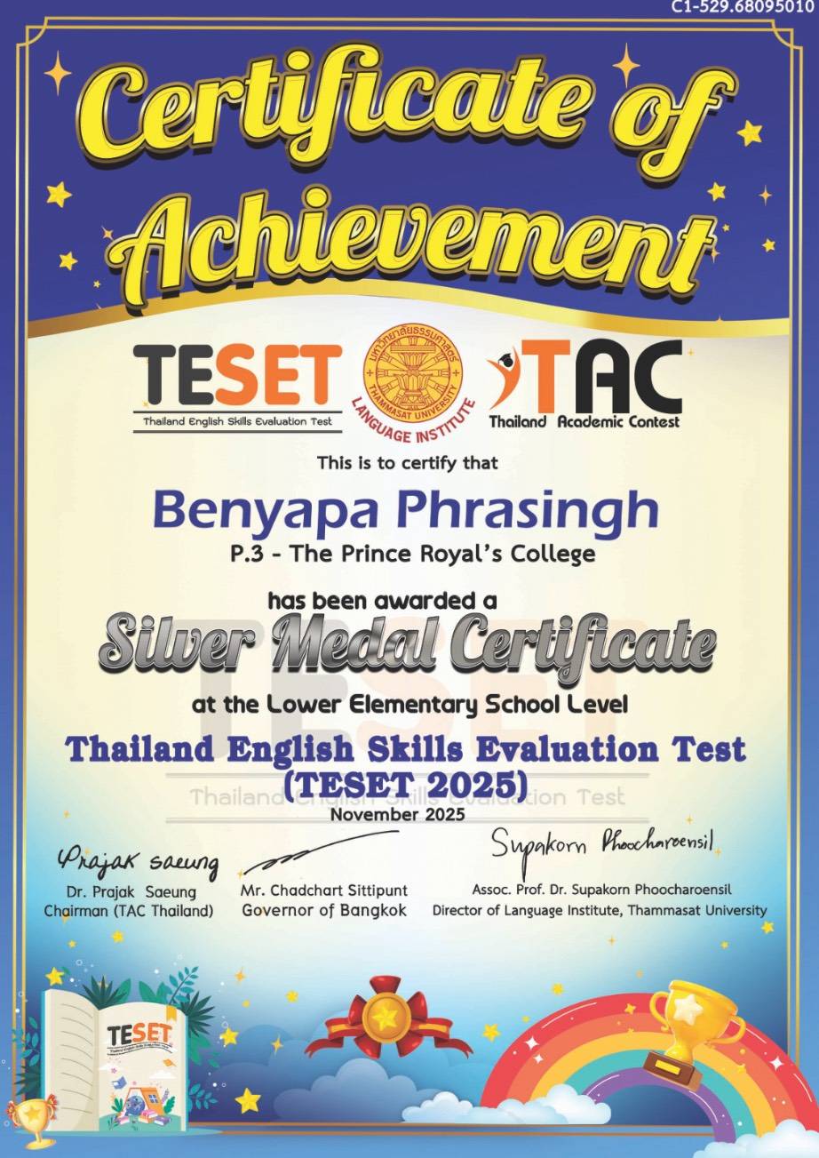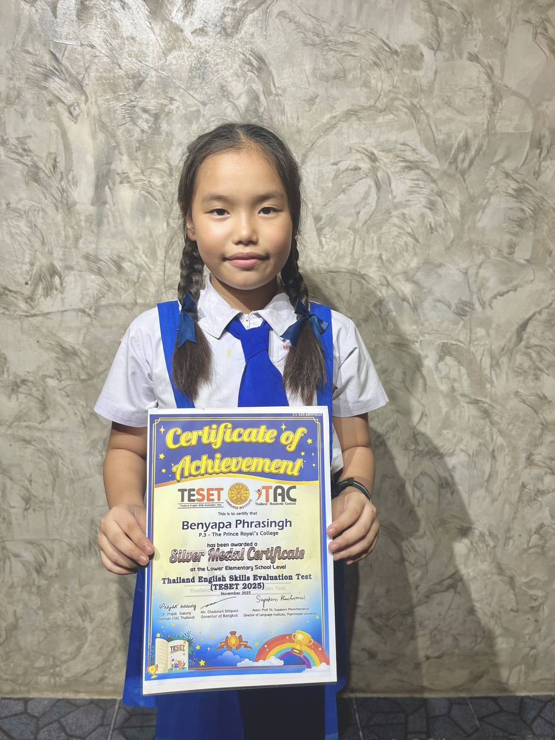 ขอชื่นชมและร่วมแสดงความยินดีกับเด็กหญิงเบญญาภา พระสิงห์  นักเรียนระดับชั้นประถมศึกษาปีที่ 3/1 ได้รับ เกียรติบัตรเหรียญเงิน รายการ Thailand English Skills Evaluation Test ( TESET) 2025 ประเมินภาษาอังกฤษระดับประเทศ ประจำปี 2568