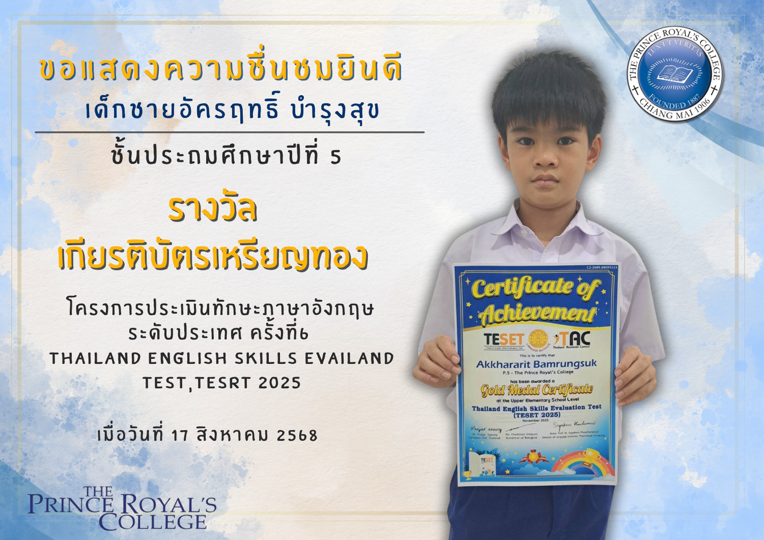 ขอแสดงความยินดีกับเด็กชายอัครฤทธิ์ บำรุงสุข นักเรียนชั้นประถมศึกษาปีที่5