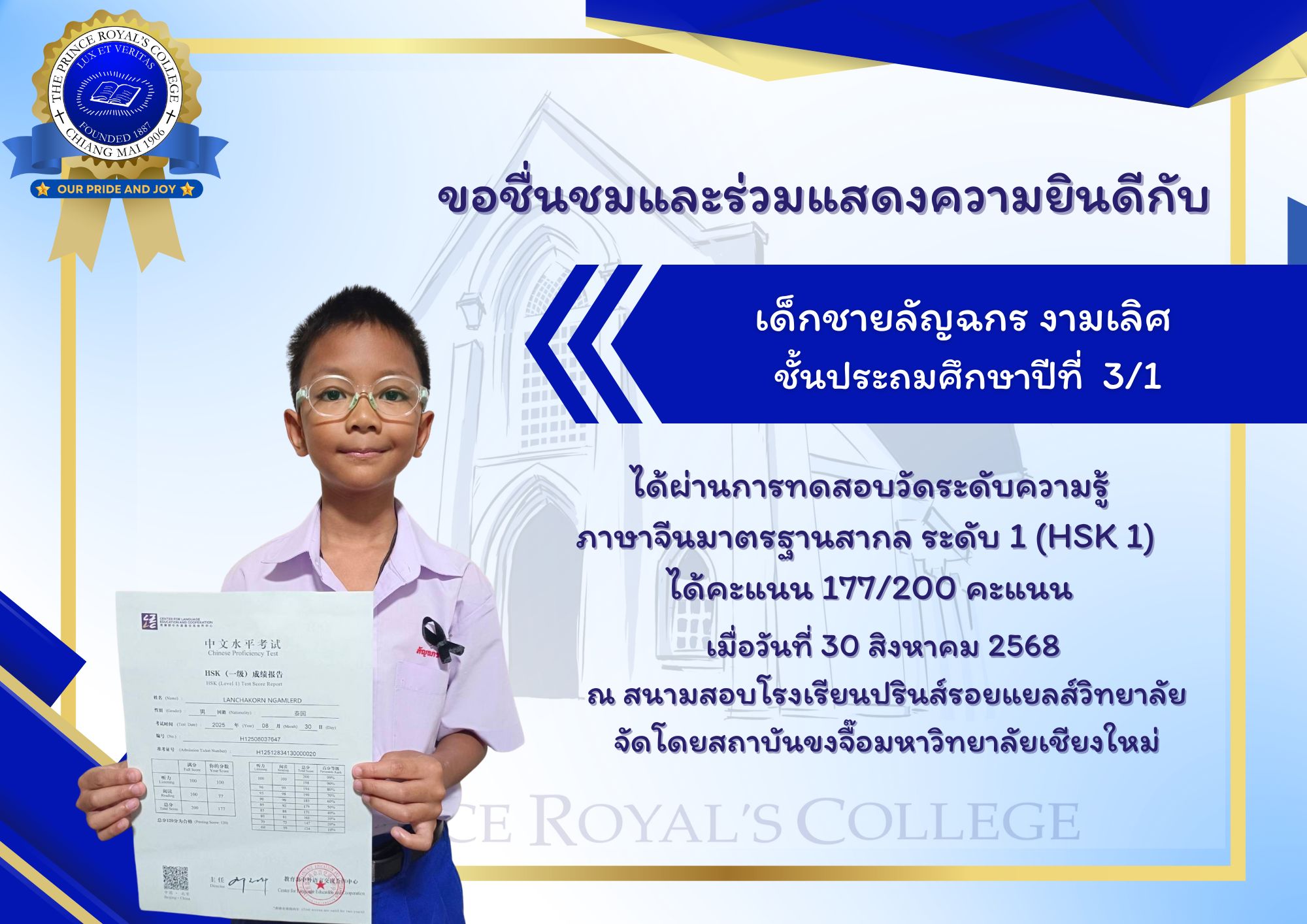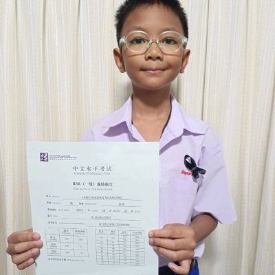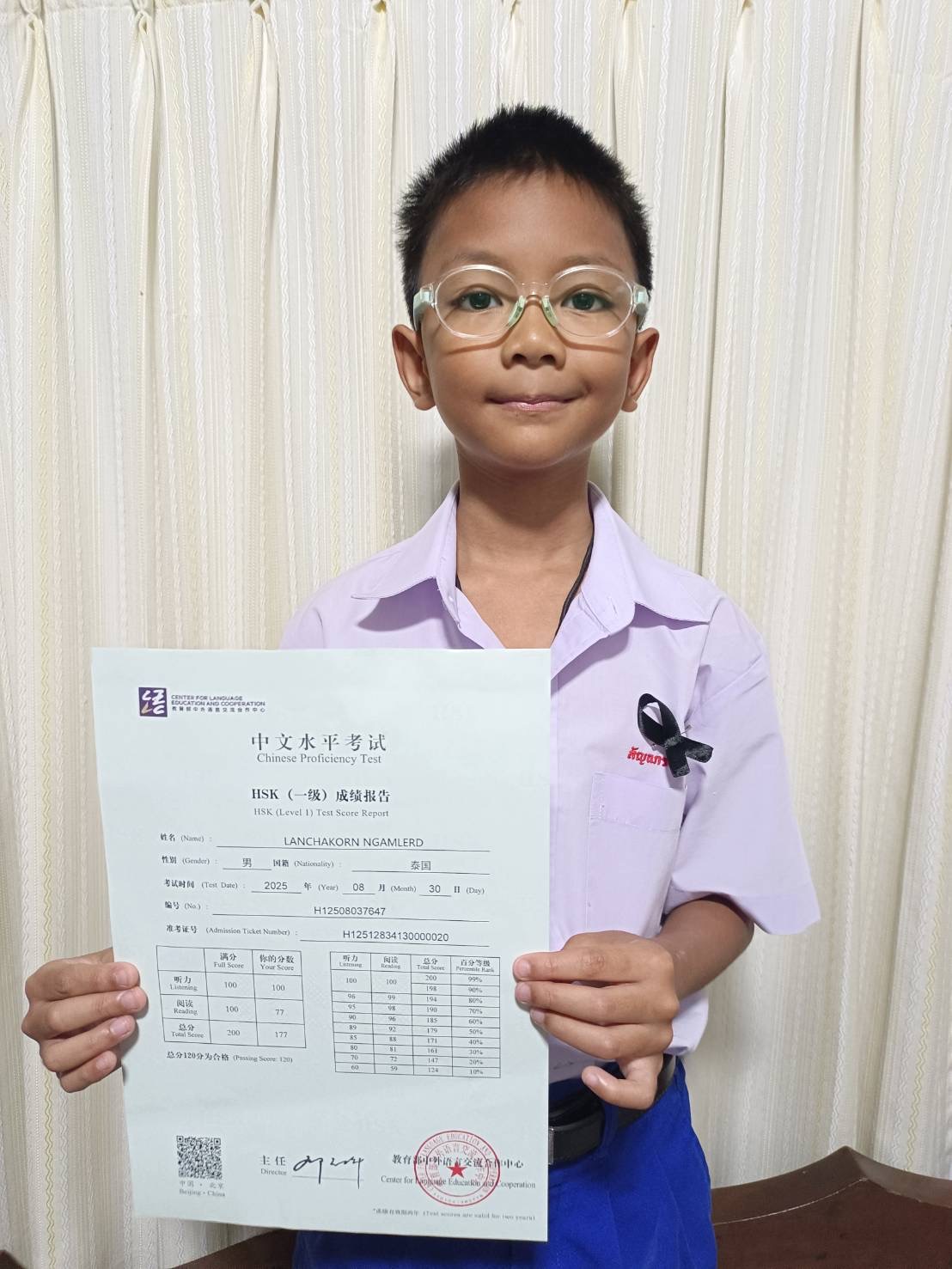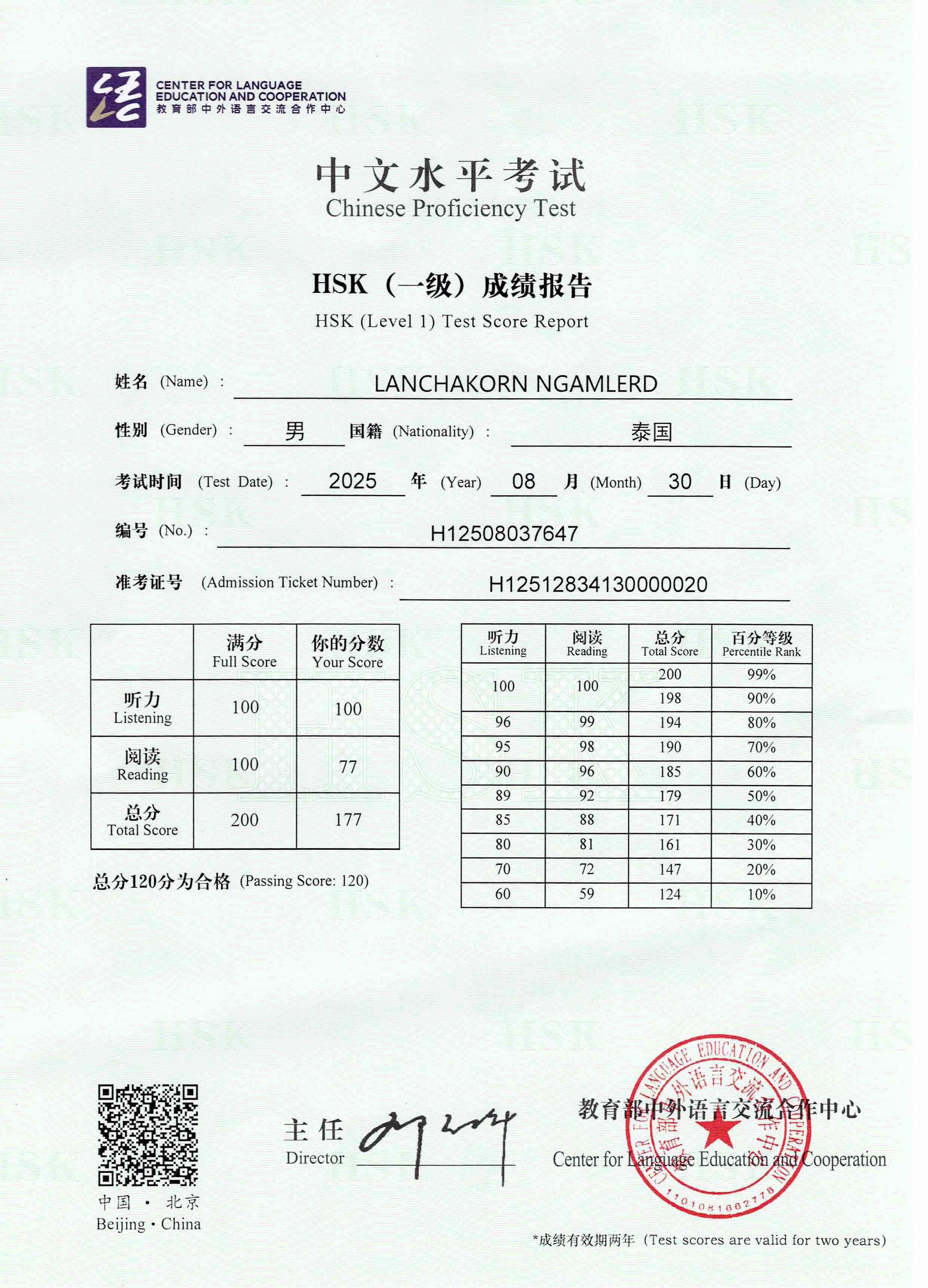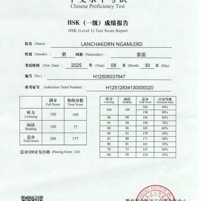 ได้ผ่านการทดสอบวัดระดับความรู้ภาษาจีนมาตรฐานสากล ระดับ 1 (HSK 1) ได้คะแนน 177/200 คะแนน