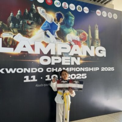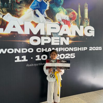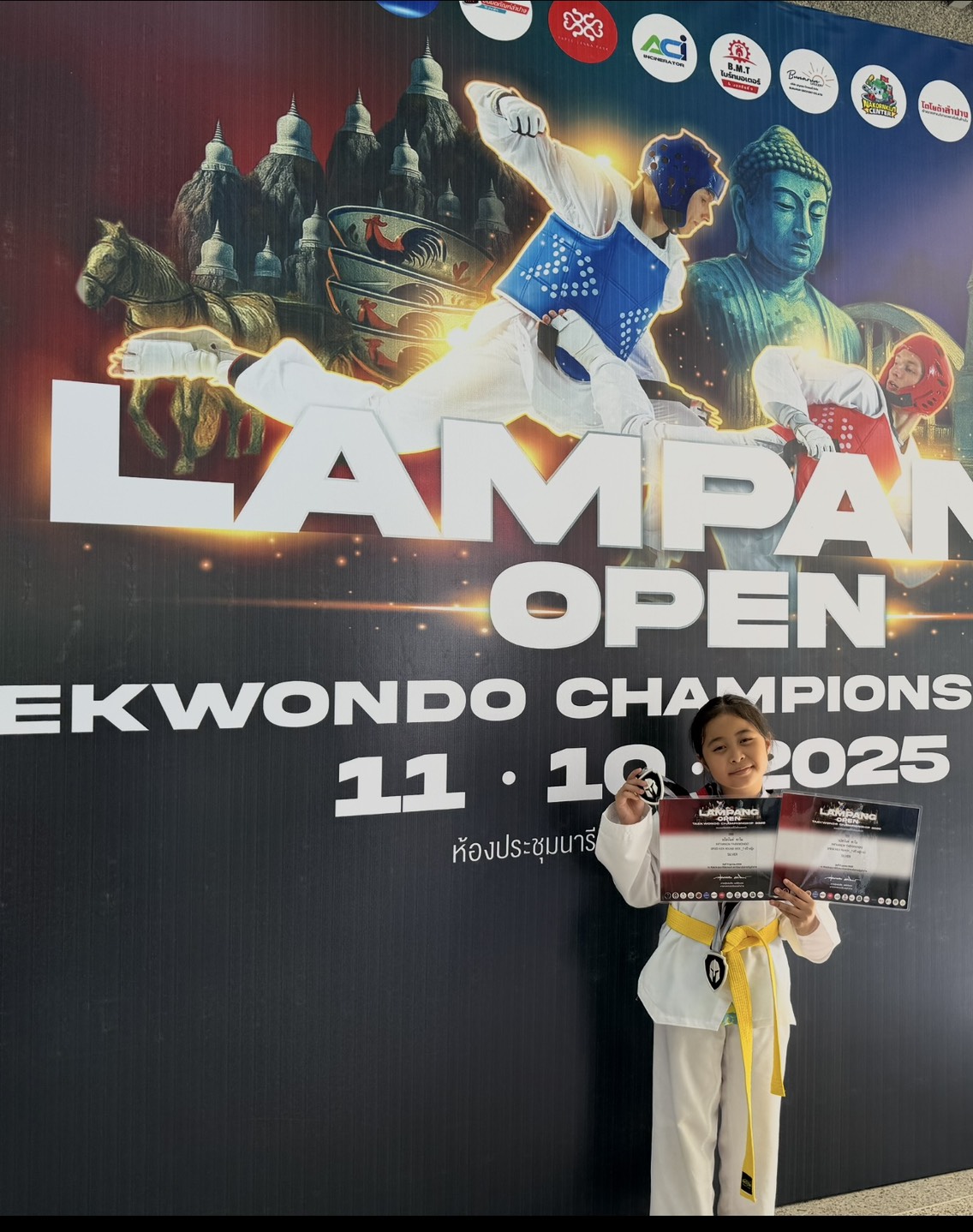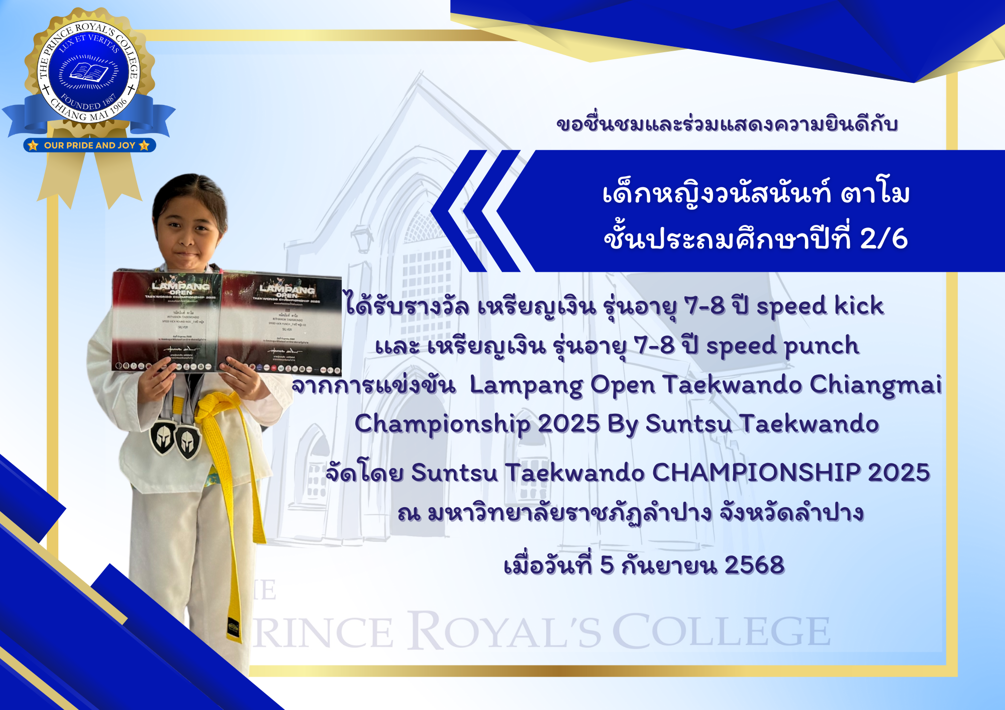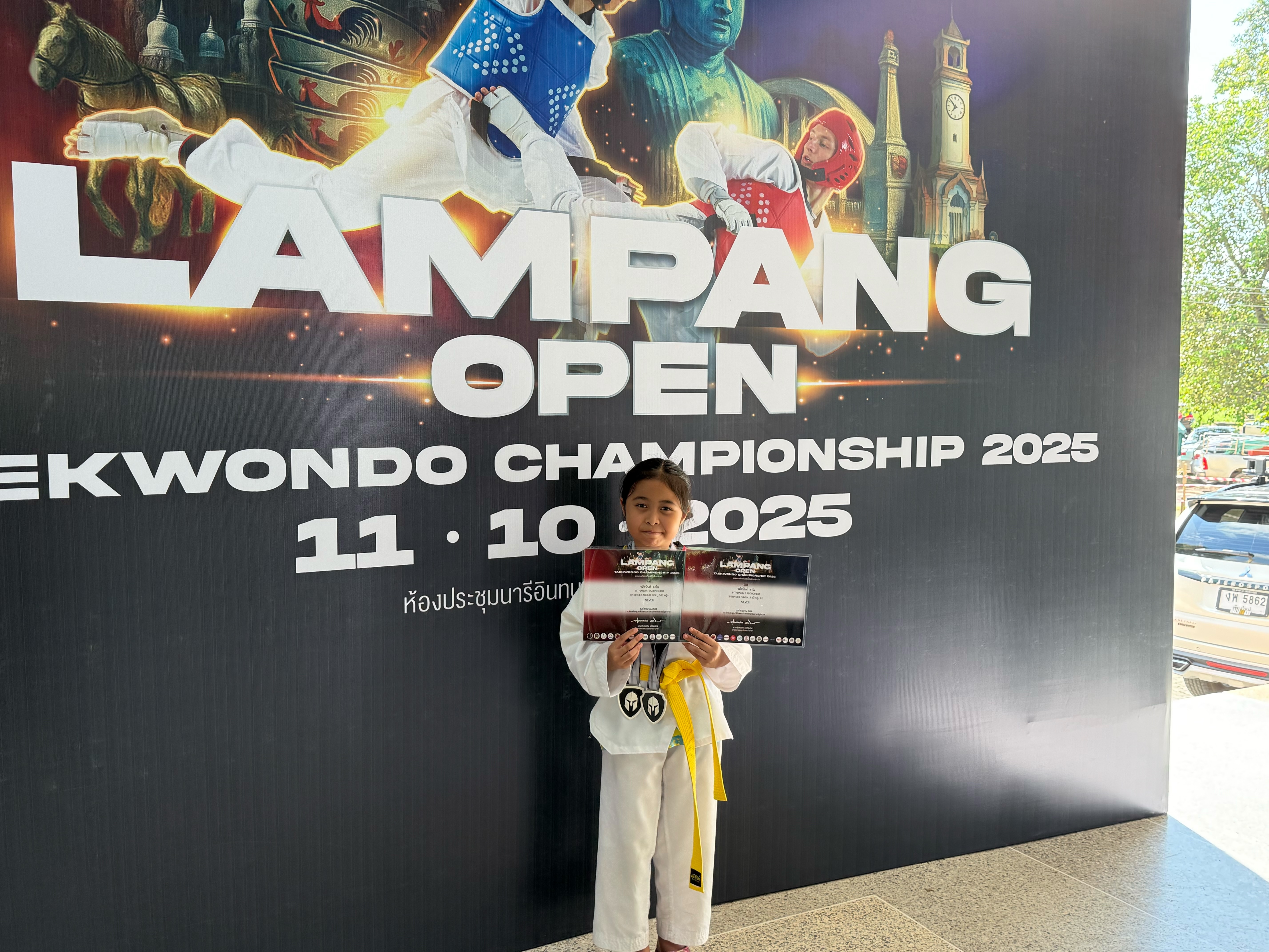 ได้รับรางวัล เหรียญเงิน รุ่นอายุ 7-8 ปี speed kick เเละ เหรียญเงิน รุ่นอายุ 7-8 ปี speed punch จากการแข่งขัน Lampang Open Taekwando Chiangmai Championship 2025 By Suntsu Taekwando