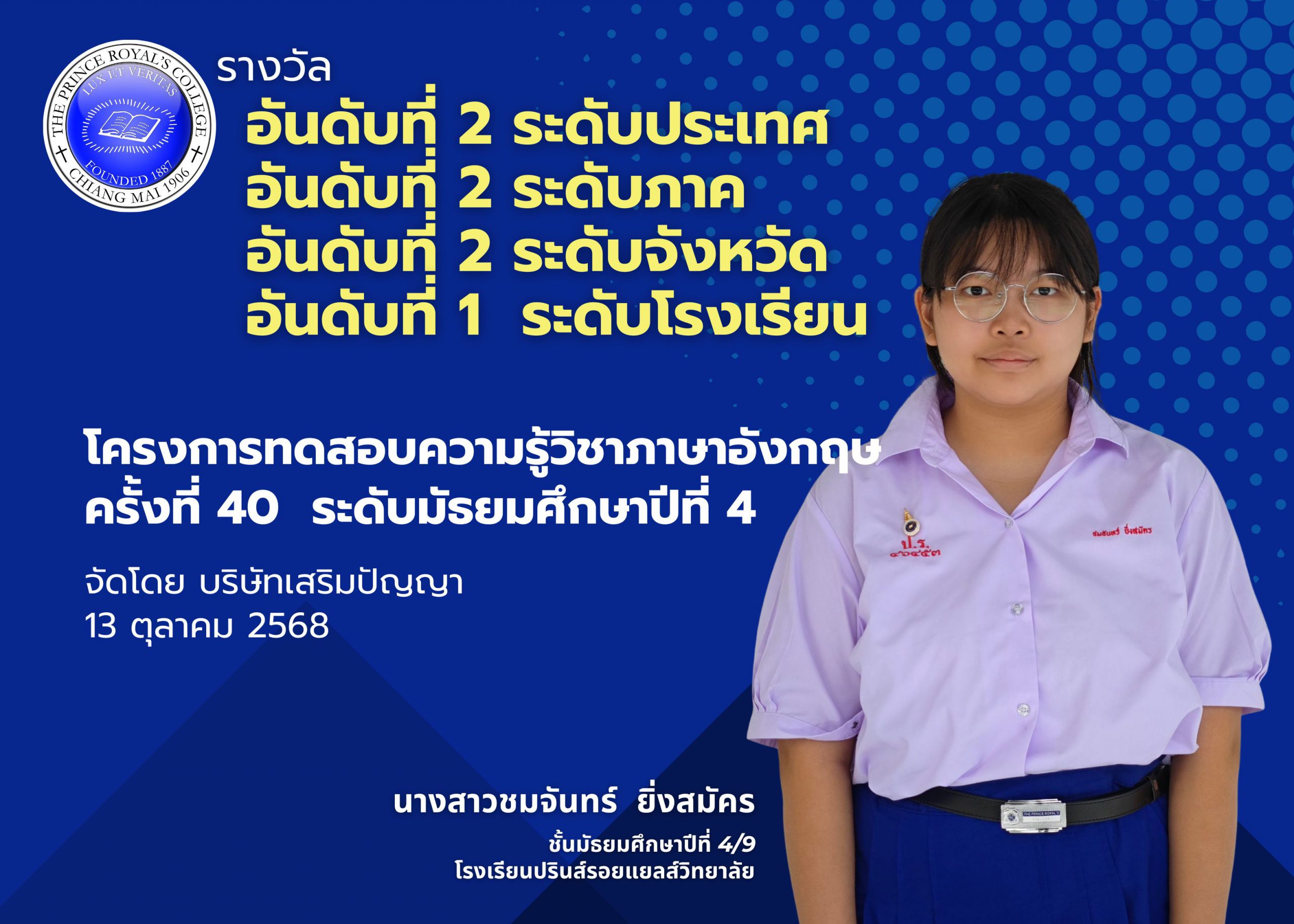 ขอชื่นชมและแสดงความยินดีกับ นางสาวชมจันทร์ ยิ่งสมัคร ม.4/9 ที่สอบวัดความรู้ภาษาอังกฤษได้อันดับที่ 2 ระดับประเทศ, อันดับที่ 2 ระดับภาค, อันดับที่ 2 ระดับจังหวัด และอันดับที่ 1 ระดับโรงเรียน จากโครงการทดสอบความรู้วิชาภาษาอังกฤษ ครั้งที่ 40 (2568) ระดับมัธยมศึกษาปีที่ 4 จัดโดย บริษัท เสริมปัญญา จำกัด ประกาศผลเมื่อวันที่ 13 ตุลาคม 2568 (ระดับประเทศ)