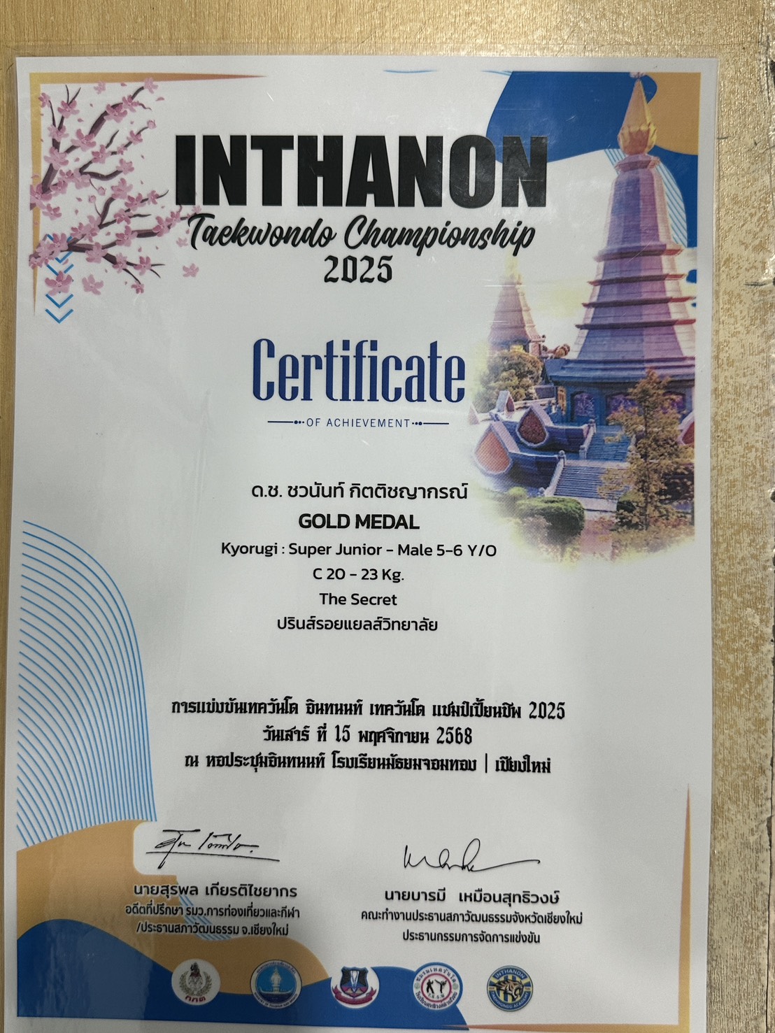 💠เหรียญทอง   ประเภทต่อสู้ ชาย รุ่นอายุ 5 – 6 ปี  Kyorugi C 20-23 kg.
