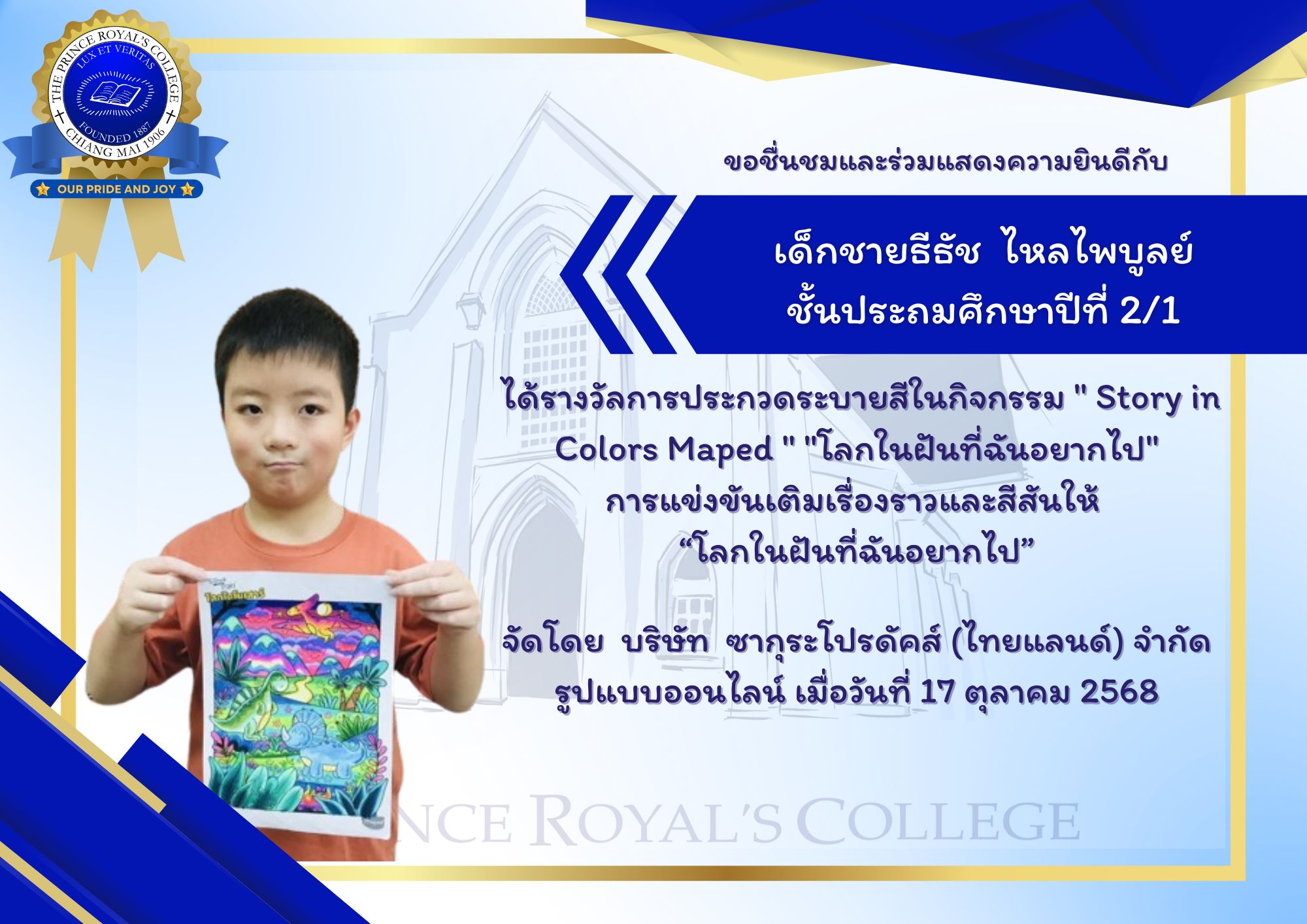 ขอชื่นชมและร่วมแสดงความยินดีกับ เด็กชายธีธัช ไหลไพบูลย ชั้นประถมศึกษาปีที่ 2/1 ได้รางวัลการประกวดระบายสีในกิจกรรม ” Story in Colors Maped ” “โลกในฝันที่ฉันอยากไป”การแข่งขันเติมเรื่องราวและสีสันให้  “โลกในฝันที่ฉันอยากไป” จัดโดย บริษัท ซากุระโปรดัคส์ (ไทยแลนด์) จำกัด รูปแบบออนไลน์ เมื่อวันที่ 17 ตุลาคม 2568