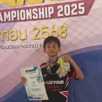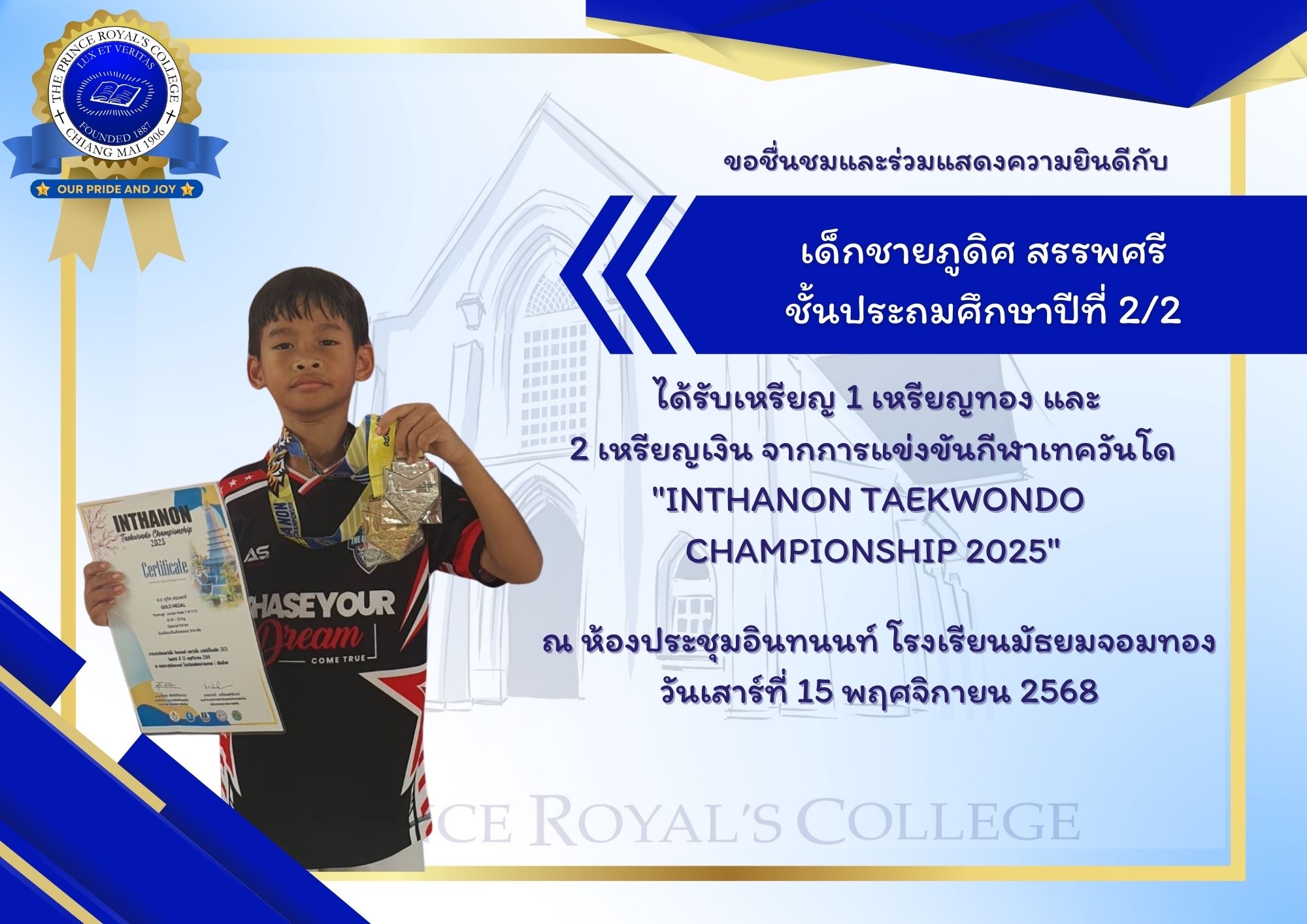 เด็กชายภูดิศ สรรพศรี ชั้นประถมศึกษาปีที่ 2/2 ได้รับเหรียญ 1 เหรียญทอง และ 2 เหรียญเงิน จากการแข่งขันกีฬาเทควันโด “INTHANON TAEKWONDO  CHAMPIONSHIP 2025”