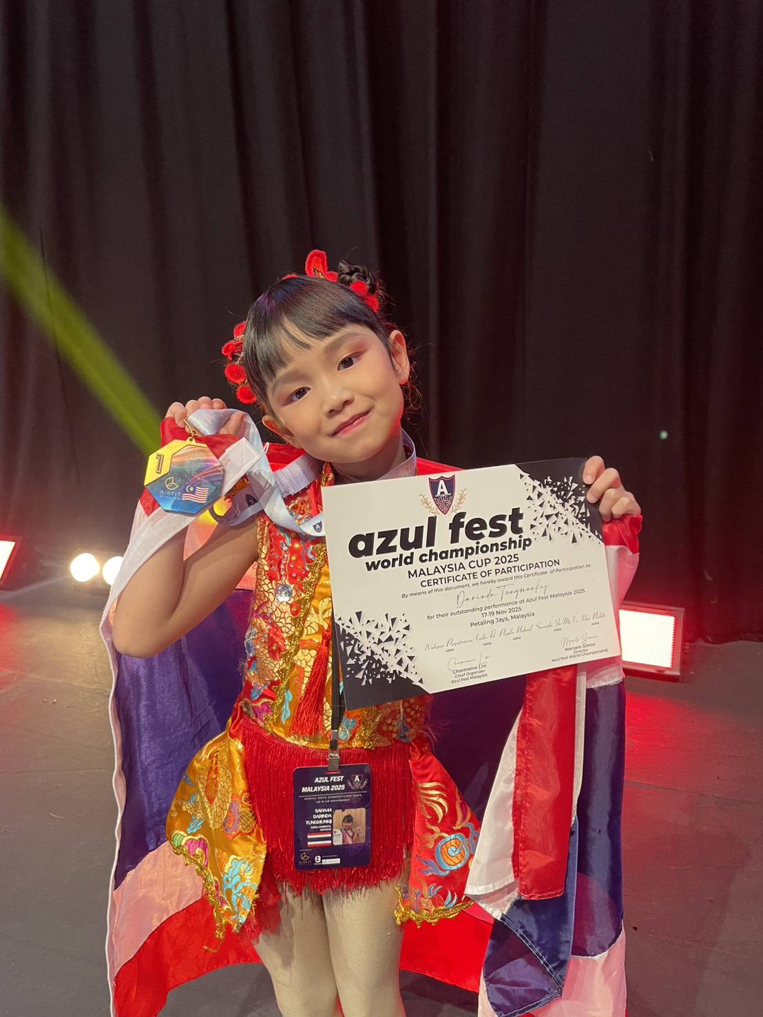 เด็กหญิงดารินทร์ดา ตั้งหมั่นกิจ ชั้นประถมศึกษาปีที่ 2/12 ได้รับรางวัลชนะเลิศ เหรียญทอง รายการ : Azul Fest Malaysia 2025  รุ่น Aerial Hammock Amateur Child A  7-9 Years