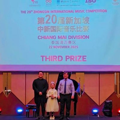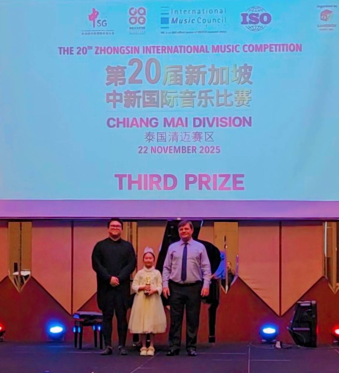 ขอชื่นชมและร่วมแสดงความยินดีกับเด็กหญิงอคิราภ์ เลิศเกียรติดำรงค์ ชั้นประถมศึกษาปีที่ 2/5 ได้รับรางวัล 3rd Prize รายการแข่งขัน The 20th Zhongshin International Music Competition ประเภท Piano Category 8-9 yrs. จัดโดย International Music Council /UNESCO ณ โรงแรมแชงกรีล่า เชียงใหม่ เมื่อวันที่ 22 พฤศจิกายน 2568