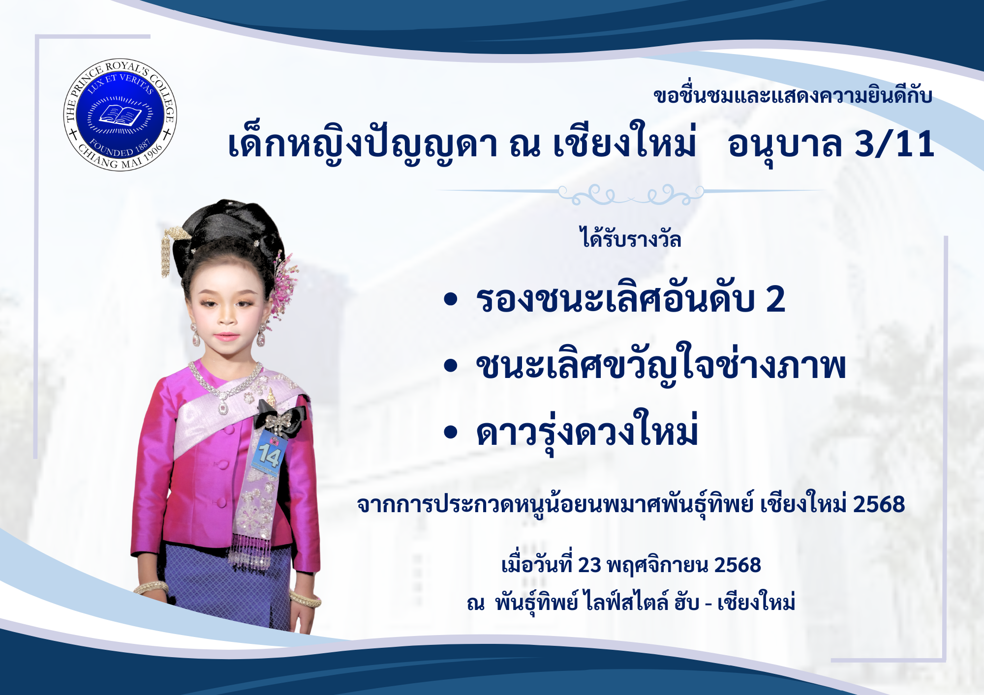 ขอชื่นชมและแสดงความยินดีกับ 🔅เด็กหญิงปัญญดา ณ เชียงใหม่ ชั้นอนุบาล 3/11🔅