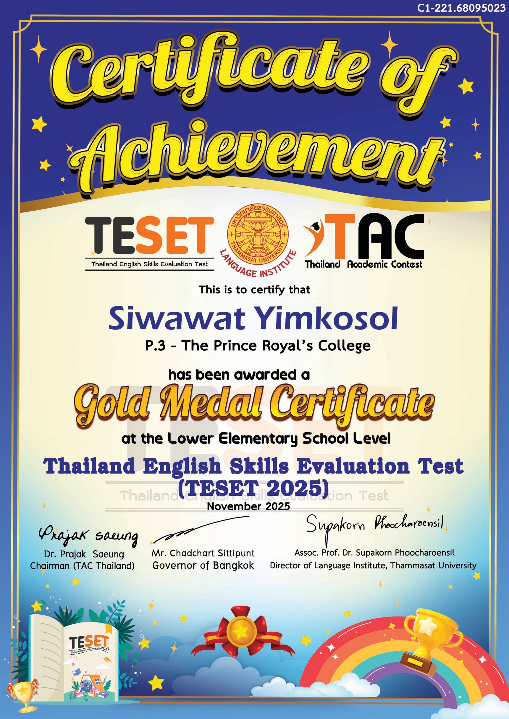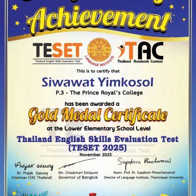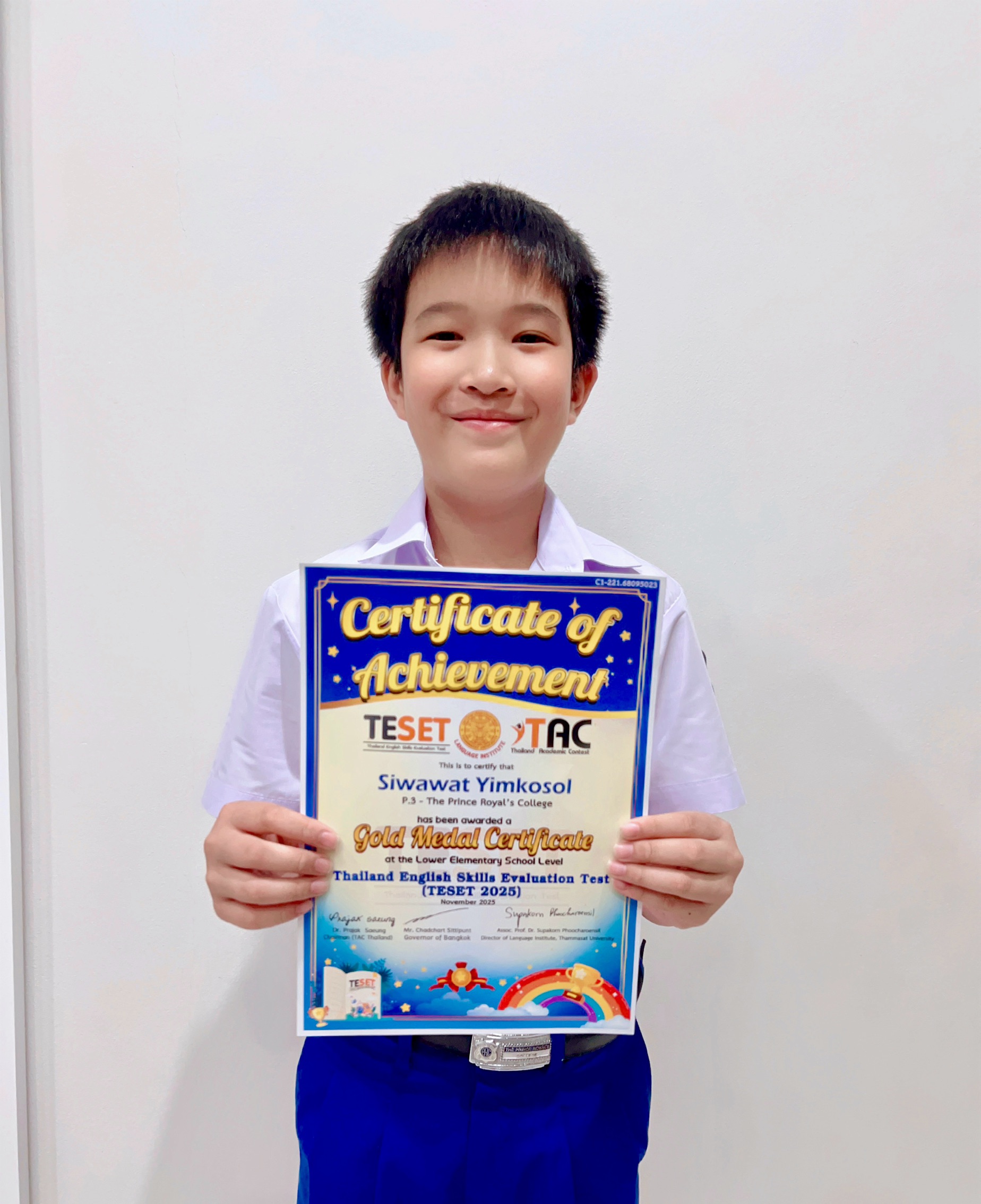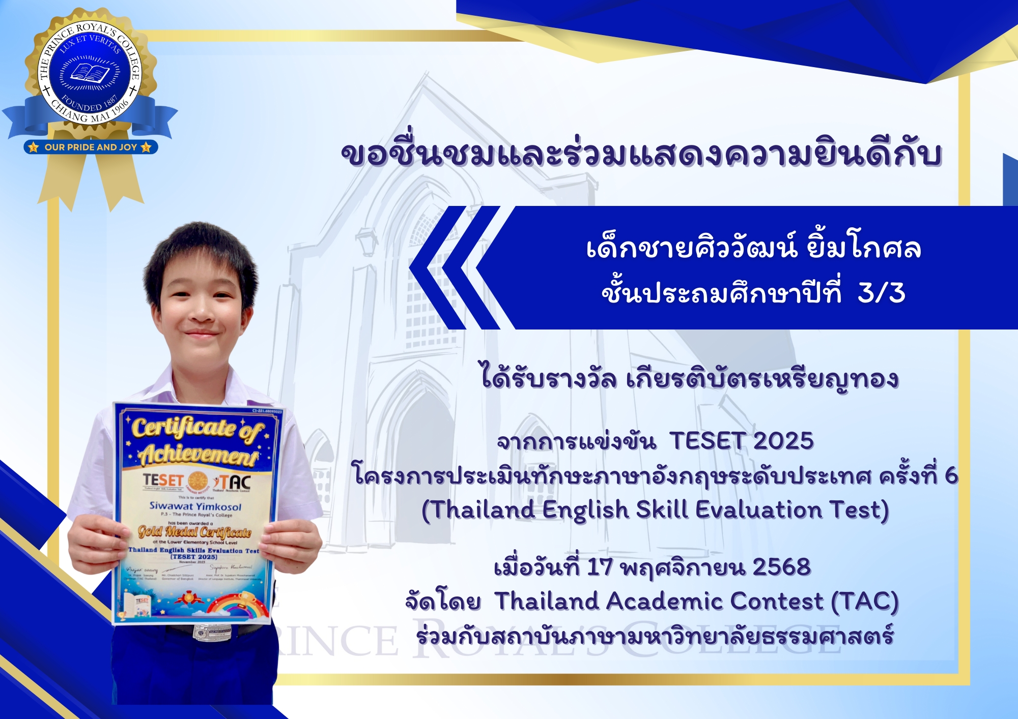 ขอชื่นชมและร่วมแสดงความยินดีกับเด็กชายศิววัฒน์ ยิ้มโกศล ชั้นประถมศึกษาปีที่ 3/3 ได้รับรางวัล เกียรติบัตรเหรียญทอง จากการแข่งขัน TESET 2025 โครงการประเมินทักษะภาษาอังกฤษระดับประเทศ ครั้งที่ 6 (Thailand English Skill Evaluation Test)
