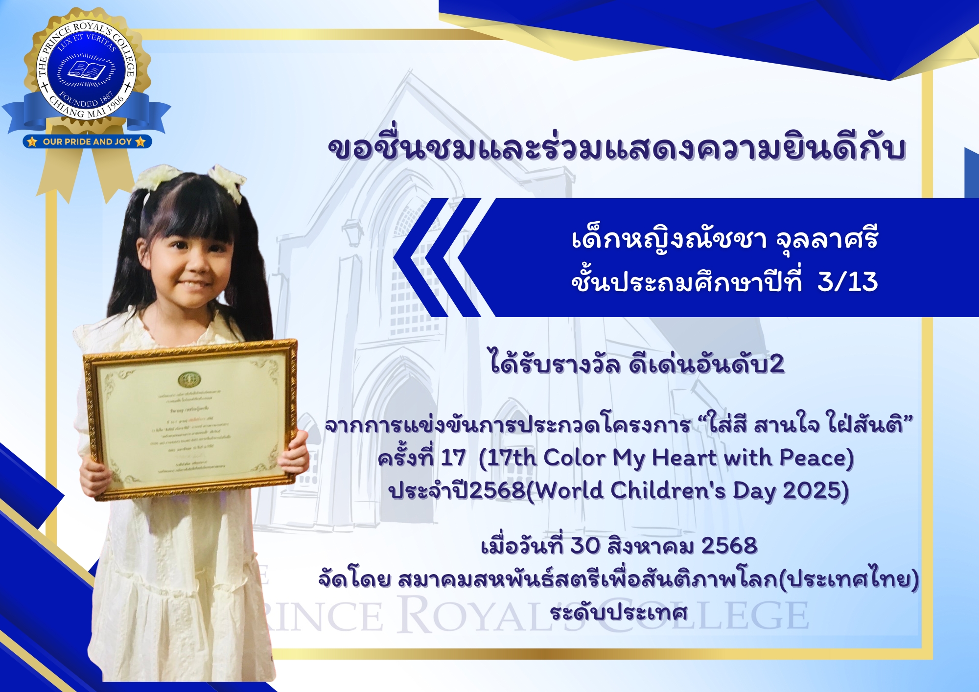 ขอชื่นชมและร่วมแสดงความยินดีกับ เด็กหญิงณัชชา จุลลาศรี ชั้นประถมศึกษาปีที่ 3/13 ได้รับรางวัล ดีเด่นอันดับ2 จากการแข่งขัน การประกวดโครงการ “ใส่สี สานใจ ใฝ่สันติ” ครั้งที่ 17 (17th Color My Heart with Peace) ประจำปี2568(World Children’s Day 2025)