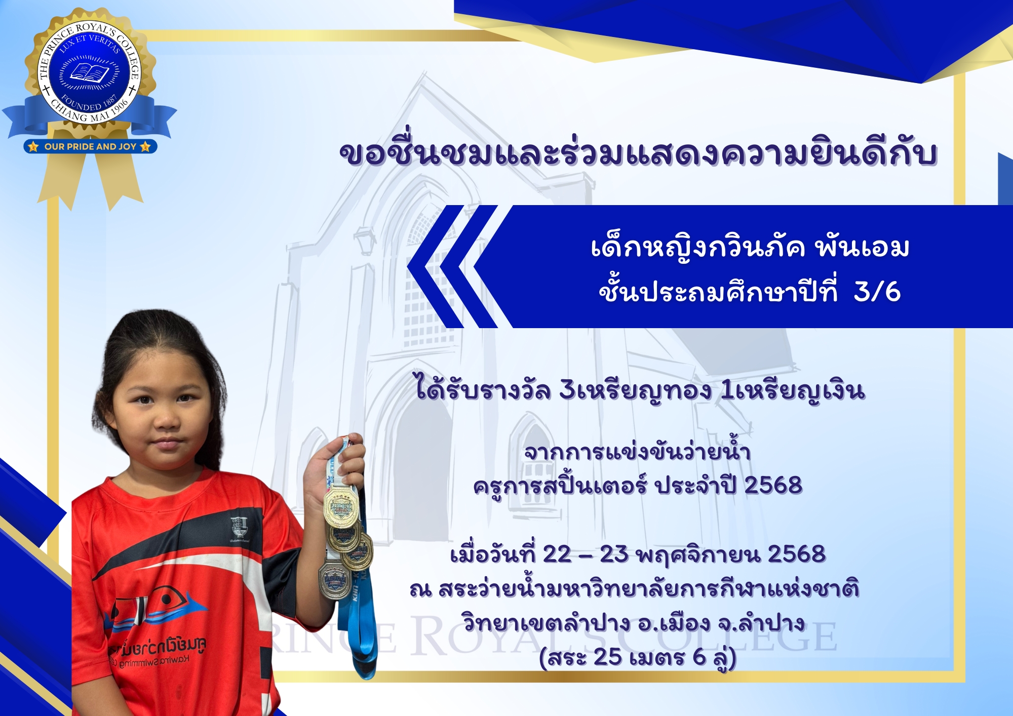 ขอชื่นชมและร่วมแสดงความยินดีกับเด็กหญิงกวินภัค พันเอม ชั้นประถมศึกษาปีที่ 3/6 ได้รับรางวัล 3เหรียญทอง 1เหรียญเงิน จากการแข่งขัน ว่ายน้ำครูการสปิ้นเตอร์ ประจำปี 2568