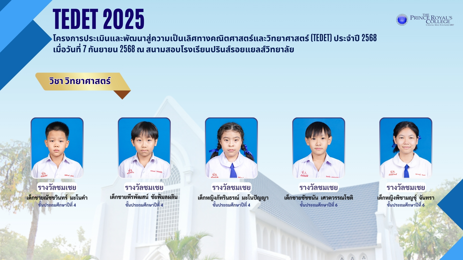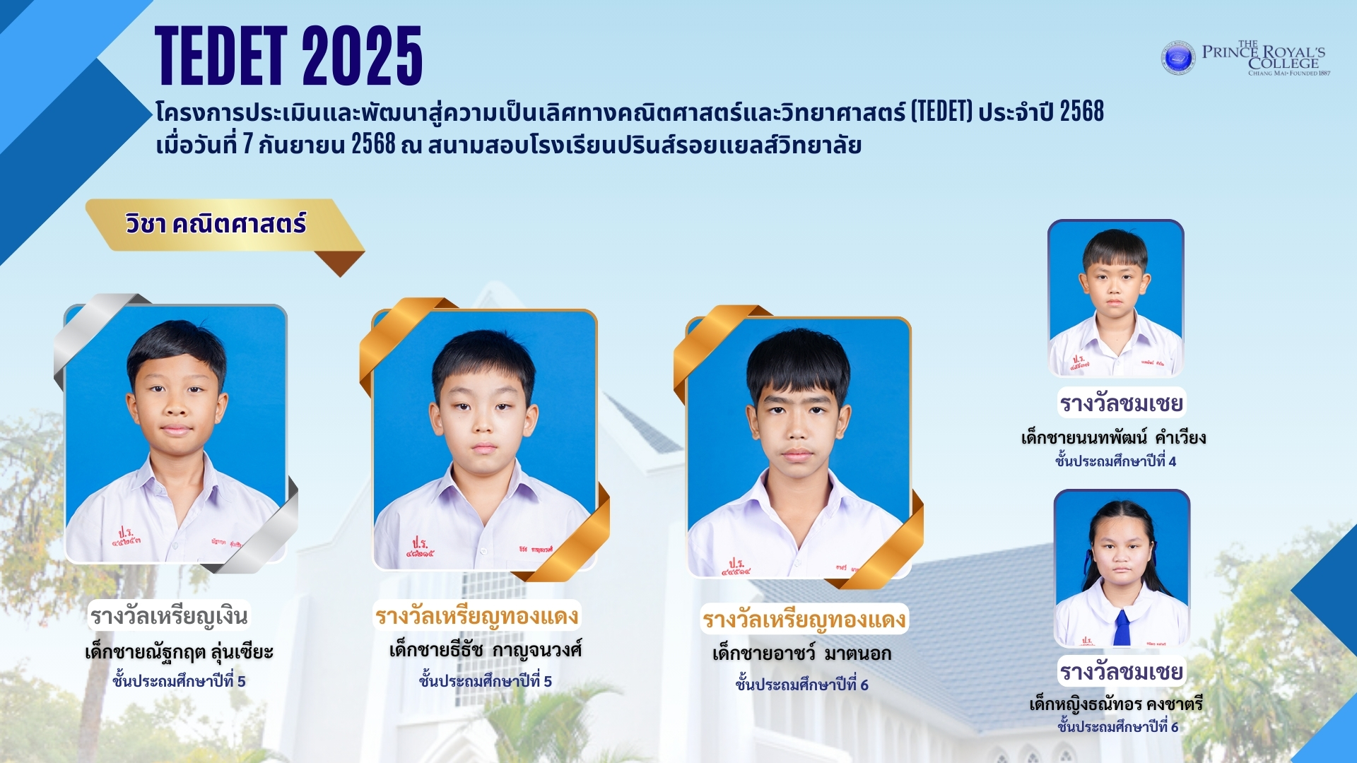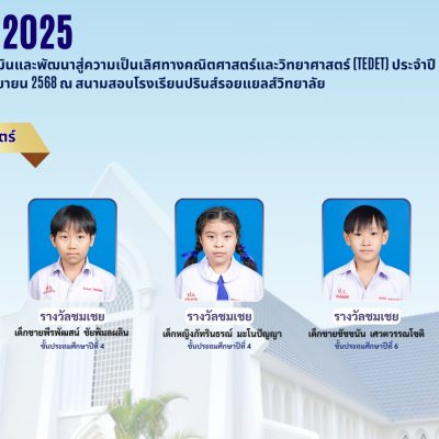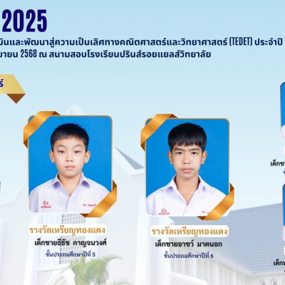 ขอชื่นชมและแสดงความยินดีกับนักเรียนระดับชั้นประถมศึกษาปีที่ 4 – 6 ที่ได้รับรางวัลจากการโครงการประเมินและพัฒนาสู่ความเป็นเลิศทางคณิตศาสตร์และวิทยาศาสตร์ (TEDET) ประจำปี 2568
