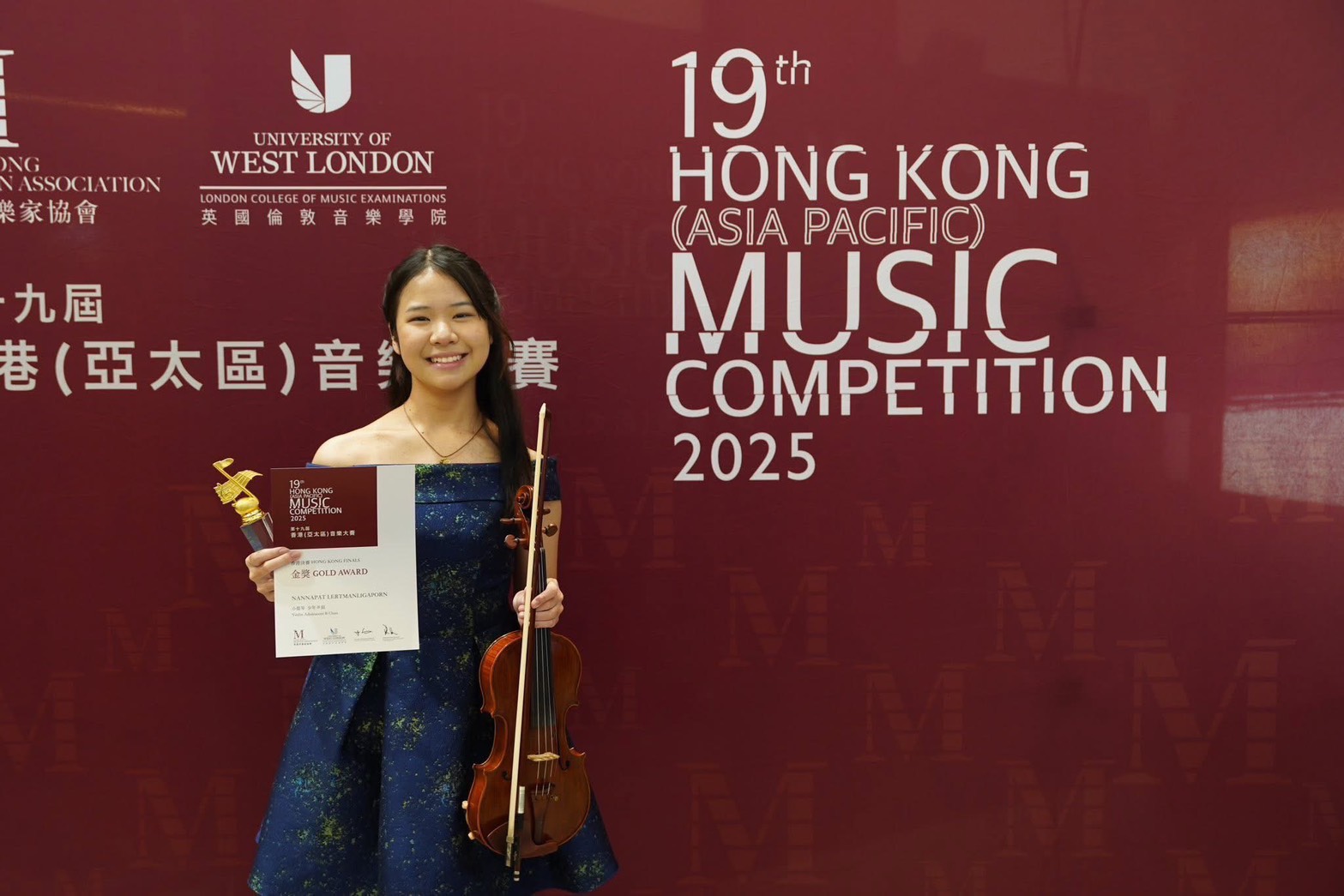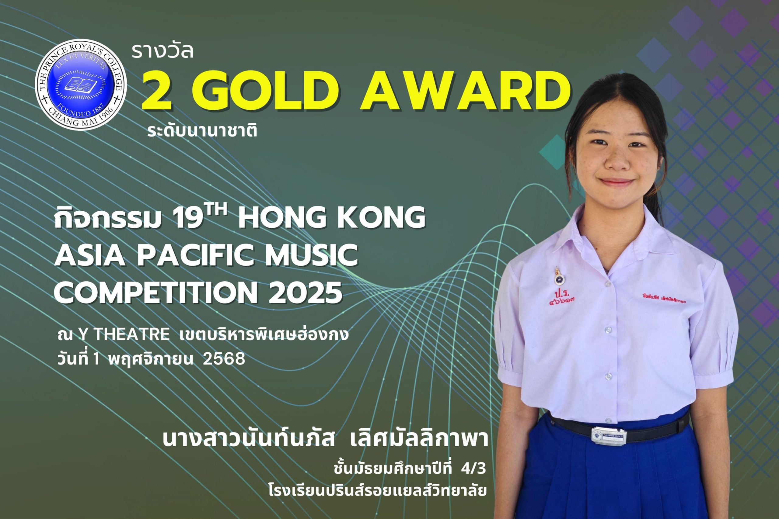 ขอชื่นชมและแสดงความยินดีกับ นางสาวนันท์นภัส เลิศมัลลิกาพา ชั้นมัธยมศึกษาปีที่ 4/3 ที่ได้รับ 2 รางวัล Gold Award จากการแข่งขัน Violin รุ่น Adolescent B Class และรางวัล Gold Award จากการแข่งขัน Acoustic Guitar รุ่น Adolescent B Class จากการแข่งขันดนตรี The 19th Hong Kong Asia Pacific Music Competition 2025 รอบชิงชนะเลิศ จัดโดย Hong Kong Musician Association ณ Y-Theatre, เขตบริหารพิเศษฮ่องกง แห่งสาธารณรัฐประชาชนจีน เมื่อวันที่ 1 พฤศจิกายน 2568 (ระดับนานาชาติ)