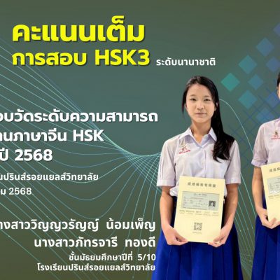 ขอชื่นชมและแสดงความยินดีกับ นางสาววิญญวรัญญ์ น้อมเพ็ญ ชั้นมัธยมศึกษาปีที่ 5/10 และ นางสาวภัทรจารี ทองดี ชั้นมัธยมศึกษาปีที่ 5/10 ที่สอบ HSK 3 ได้คะแนนเต็ม 300/300 จากการสอบวัดระดับความรู้ทางด้านภาษาจีน HSK ประจำปี 2568 จัดโดย Center for Language Education And Cooperation of China ณ โรงเรียนปรินส์รอยแยลส์วิทยาลัย สอบเมื่อวันที่ 30 สิงหาคม 2568 (ระดับนานาชาติ)
