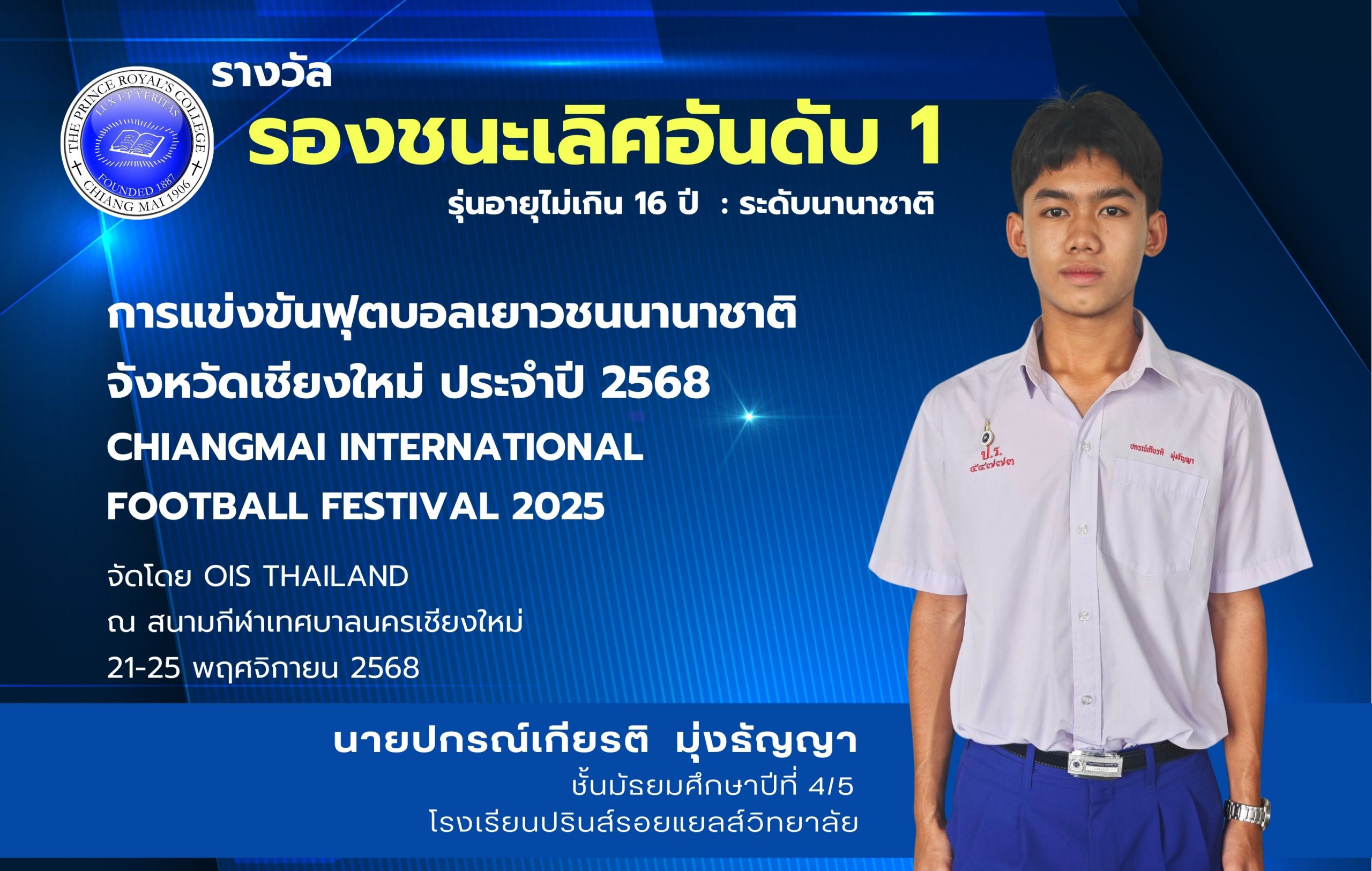 ขอชื่นชมและแสดงความยินดีกับ นายปกรณ์เกียรติ มุ่งธัญญา ชั้นมัธยมศึกษาปีที่ 4/5 รับรางวัลรองชนะเลิศอันดับ 1 รุ่นอายุไม่เกิน 16 ปี สังกัดสโมสร VACHIRALAI United จากการแข่งขันฟุตบอลเยาวชนนานาชาติ จังหวัดเชียงใหม่ ประจำปี 2568 CHIANGMAI INTERNATIONAL FOOTBALL FESTIVAL 2025 จัดโดย OIS THAILAND ณ สนามกีฬาเทศบาลนครเชียงใหม่ เมื่อวันที่ 21-25 พฤศจิกายน 2568 (ระดับนานาชาติ)