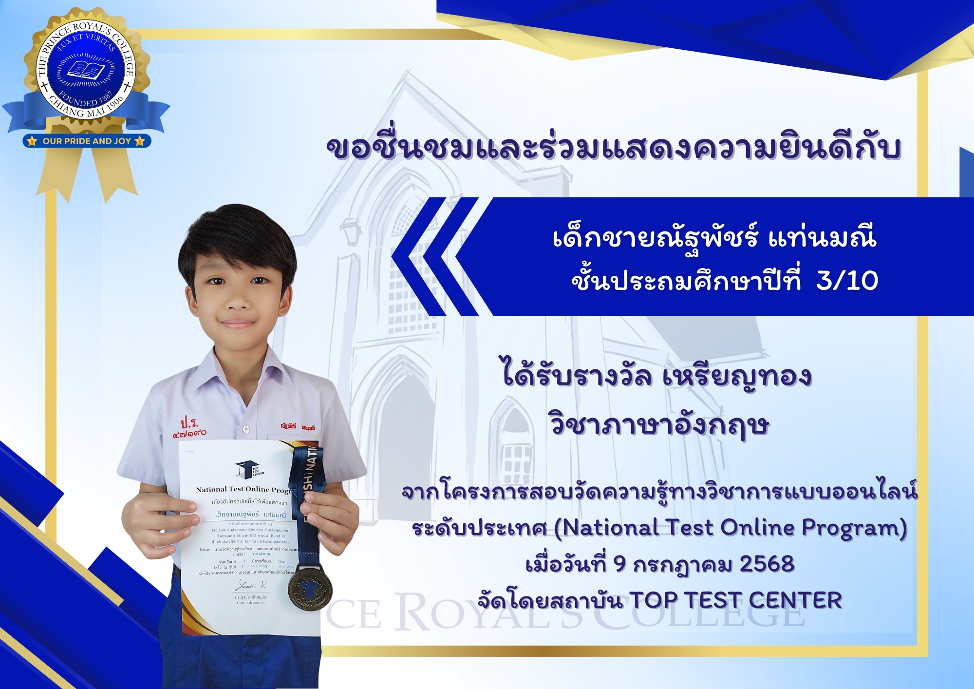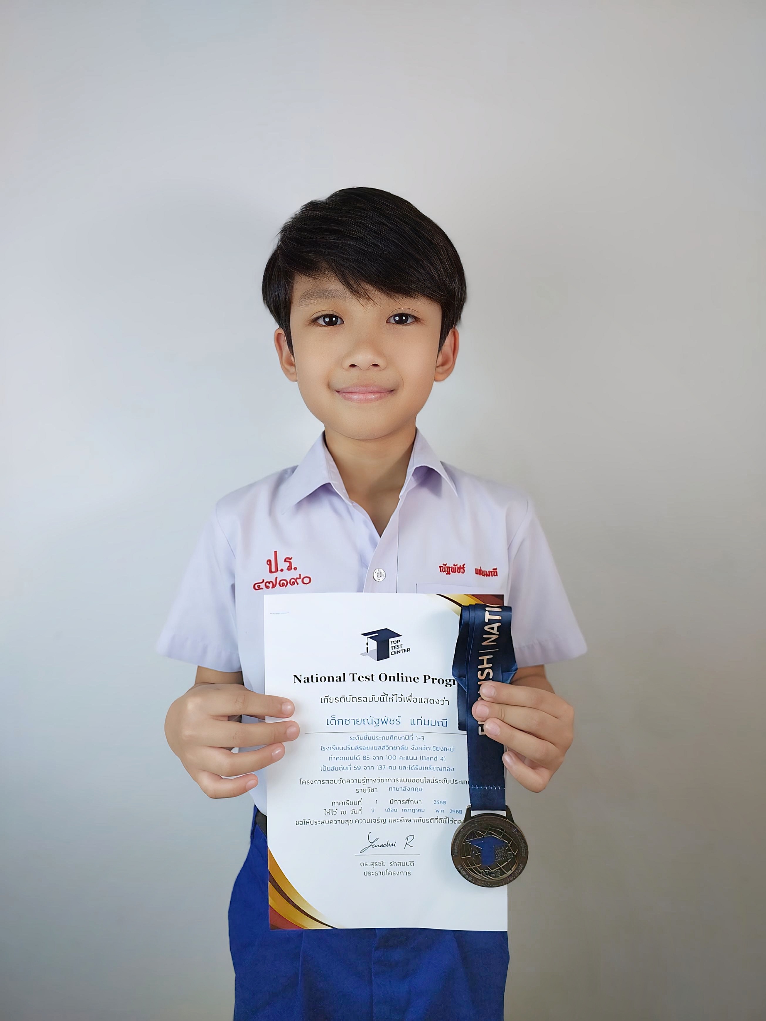 ขอชื่นชมและร่วมแสดงความยินดีกับเด็กชายณัฐพัชร์ แท่นมณี นักเรียนชั้นประถมศึกษาปีที่ 3/10 ได้รับรางวัลเหรียญทอง วิชาภาษาอังกฤษ จากโครงการสอบวัดความรู้ทางวิชาการแบบออนไลน์ระดับประเทศ (National Test Online Program)