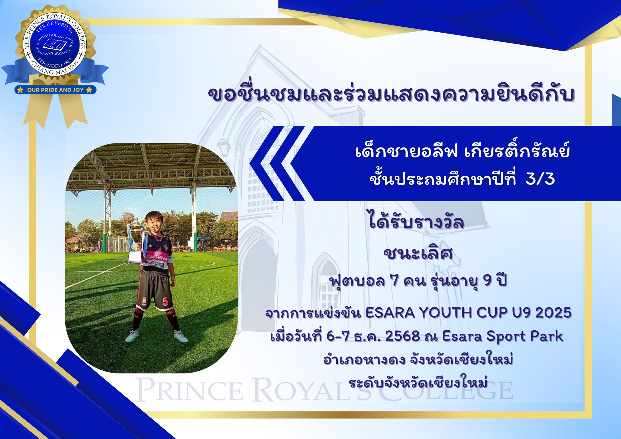 ขอชื่นชมและร่วมแสดงความยินดีกับเด็กชายอลีฟ เกียรติ์กรัณย์ นักเรียนชั้นประถมศึกษาปีที่ 3/3 ได้รับรางวัลชนะเลิศ ฟุตบอล 7 คน รุ่นอายุ 9 ปี จากการแข่งขัน ESARA YOUTH CUP U9 2025