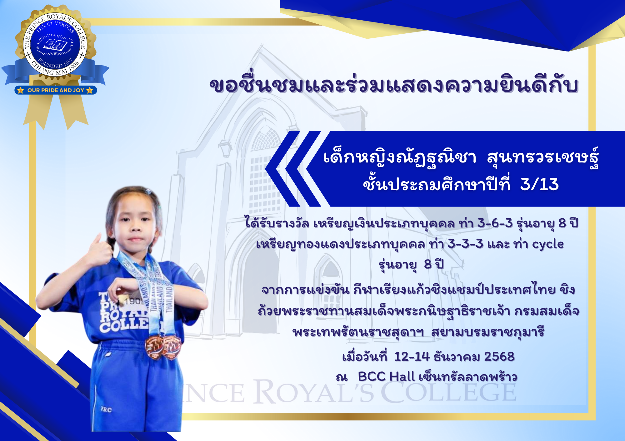 ขอชื่นชมและร่วมแสดงความยินดีกับ เด็กหญิงณัฏฐณิชา สุนทรวรเชษฐ์ ชั้นประถมศึกษาปีที่ 3/13 ได้รับรางวัล เหรียญเงิน ประเภทบุคคล ท่า 3-6-3 รุ่นอายุ 8 ปี เหรียญทองแดง ประเภทบุคคล ท่า 3-3-3 และ ท่า cycle รุ่นอายุ 8 ปี จากรายการที่ไปแข่งขัน กีฬาเรียงแก้วชิงแชมป์ประเทศไทย ชิงถ้วยพระราชทานสมเด็จพระกนิษฐาธิราชเจ้า กรมสมเด็จพระเทพรัตนราชสุดาฯ สยามบรมราชกุมารี รายการ WSSA 2025 Thailand Open Sport Stacking Championships