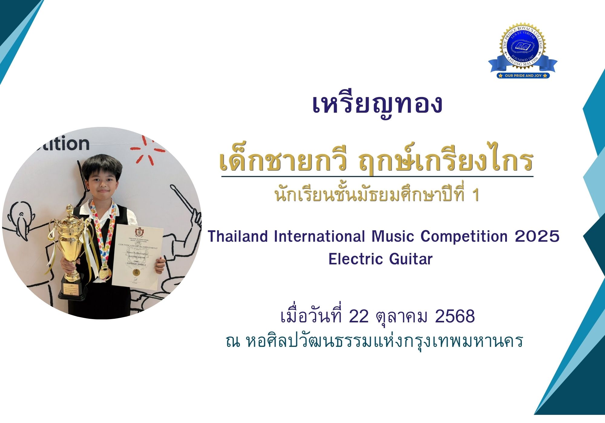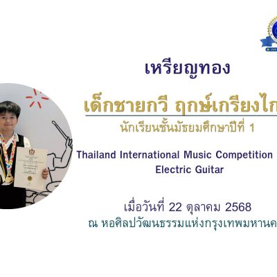 ขอชื่นชมและร่วมแสดงความยินดีกับ เด็กชายกวี ฤกษ์เกรียงไกร ชั้นมัธยมศึกษาปีที่ 1/7ได้รับเหรียญทอง และถ้วยรางวัล Best Performance (คะนนสูงสุด) รายการ Thailand International Music Competition 2025 ,Electric Guitar ,TIMC Grade Type , Category Electric Guitar Grade 2 เมื่อวันที่ 22 ตุลาคม 2568 ณ หอศิลปวัฒนธรรมแห่งกรุงเทพมหานคร จัดโดย Thailand International Music Competition