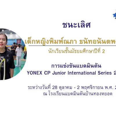 ขอชื่นชมและร่วมแสดงความยินดีกับ เด็กหญิงพิมพ์ณภา ธนัทอนันตพงศ์ ชั้นมัธยมศึกษาปีที่ 3/9 ได้รับรางวัลชนะเลิศ ประเภทหญิงคู่อายุไม่เกิน 17 ปี ในการแข่งขันแบดมินตันรายการ YONEX CP Junior International Series 2025 เก็บคะแนน BWF ณ โรงเรียนแบดมินตันบ้านทองหยอด กรุงเทพ ระหว่างวันที่ 28 ตุลาคม 2568 – 2 พฤศจิกายน 2568