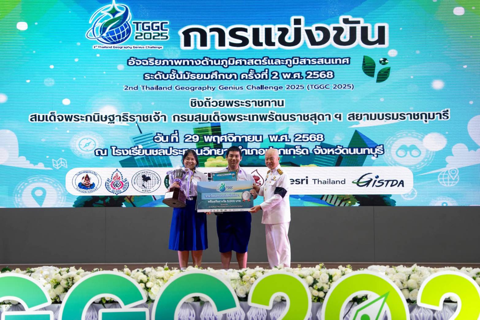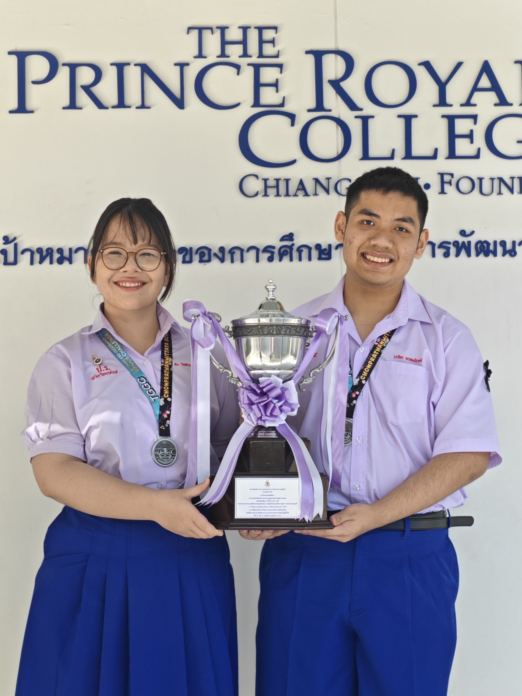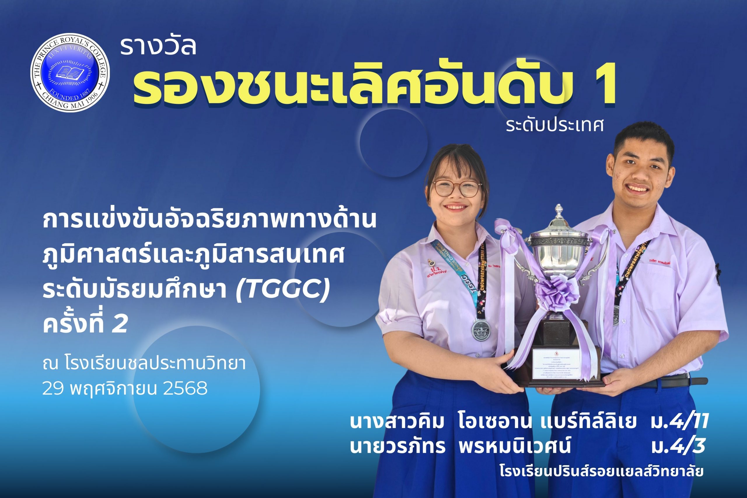 ขอชื่นชมและแสดงความยินดีกับ นางสาวคิม โอเซอาน แบร์ทิล์ลิเย ม.4/11, นายวรภัทร พรหมนิเวศน์ ม.4/3 ที่ได้รับรางวัลรองชนะเลิศอันดับ 1 รับถ้วยรางวัลสมาคมศิษย์เก่าวิศวกรรมชลประทานในพระบรมราชูปถัมภ์ พร้อมเงินรางวัล 5,000 บาท จากการแข่งขันอัจฉริยภาพทางด้านภูมิศาสตร์และภูมิสารสนเทศ ระดับมัธยมศึกษา (TGGC) ครั้งที่ 2 พ.ศ.2568 ชิงถ้วยพระราชทานสมเด็จพระกนิษฐาธิราชเจ้า กรมสมเด็จพระเทพรัตนราชสุดาฯ สยามบรมราชกุมารี จัดโดย โรงเรียนชลประทานวิทยา อำเภอปากเกร็ด จังหวัดนนทบุรี ณ โรงเรียนชลประทานวิทยา เมื่อวันที่ 29 พฤศจิกายน 2568 (ระดับประเทศ)