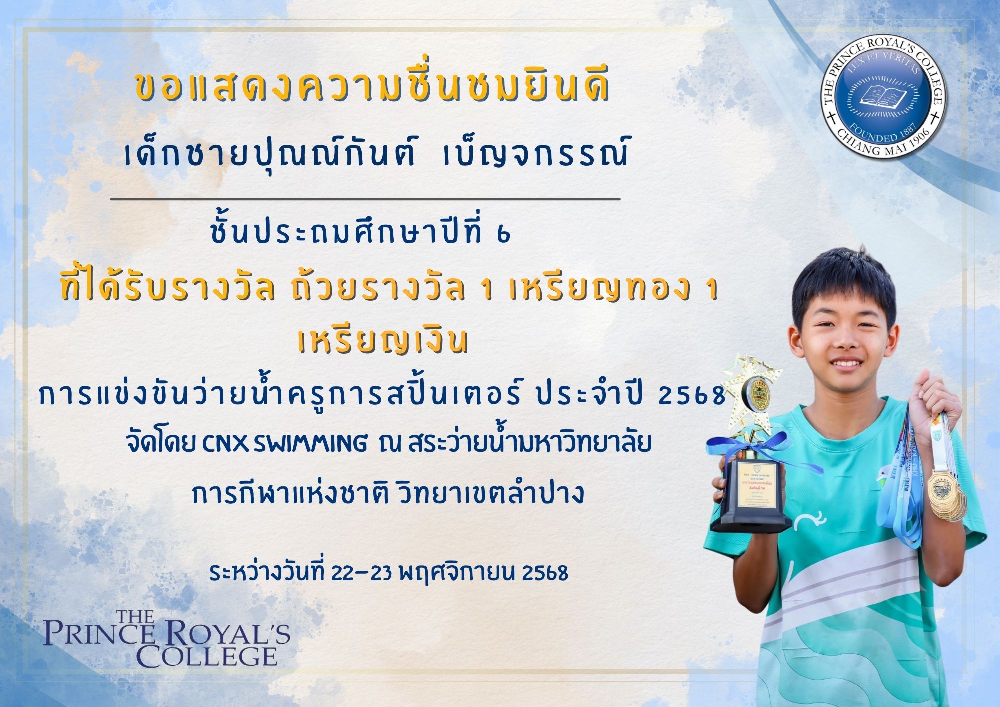ขอแสดงความชื่นชมยินดีกับเด็กชายปุณณ์กันต์  เบ็ญจกรรณ์ นักเรียนชั้นประถมศึกษาปีที่ 6 ที่ได้รับรางวัลถ้วยรางวัล ลำดับ 14 รุ่นอายุ 12 ปี ชาย การแข่งขันว่ายน้ำครูการสปิ้นเตอร์ ประจำปี 2568