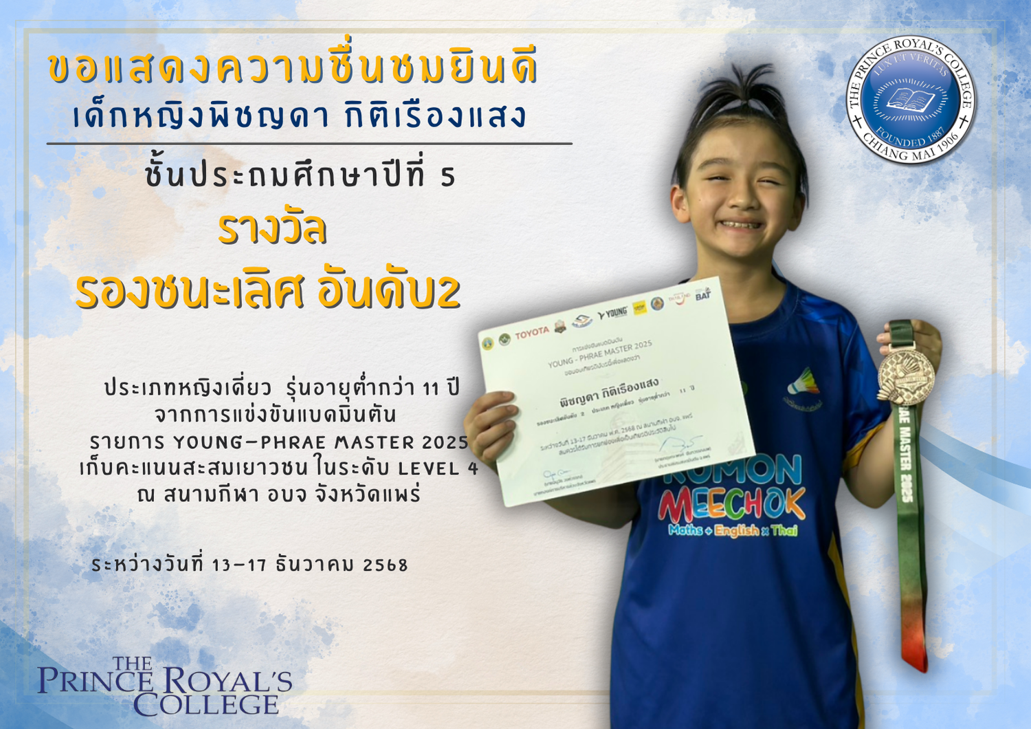 ขอแสดงความยินดีกับเด็กหญิงพิชญดา กิติเรืองแสง นักเรียนระดับชั้นประถมศึกษาปีที่ 5