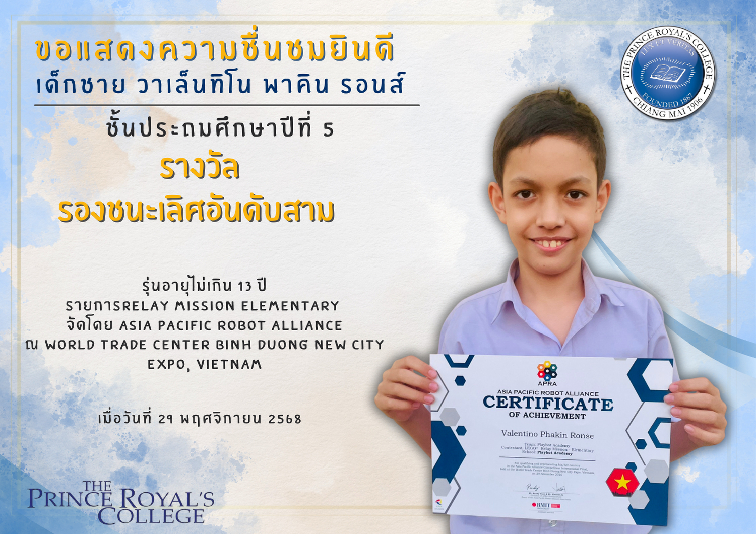 ขอแสดงความยินดีกับเด็กชาย วาเล็นทิโน พาคิน รอนส์ นักเรียนระดับชั้นประถมศึกษาปีที่ 5